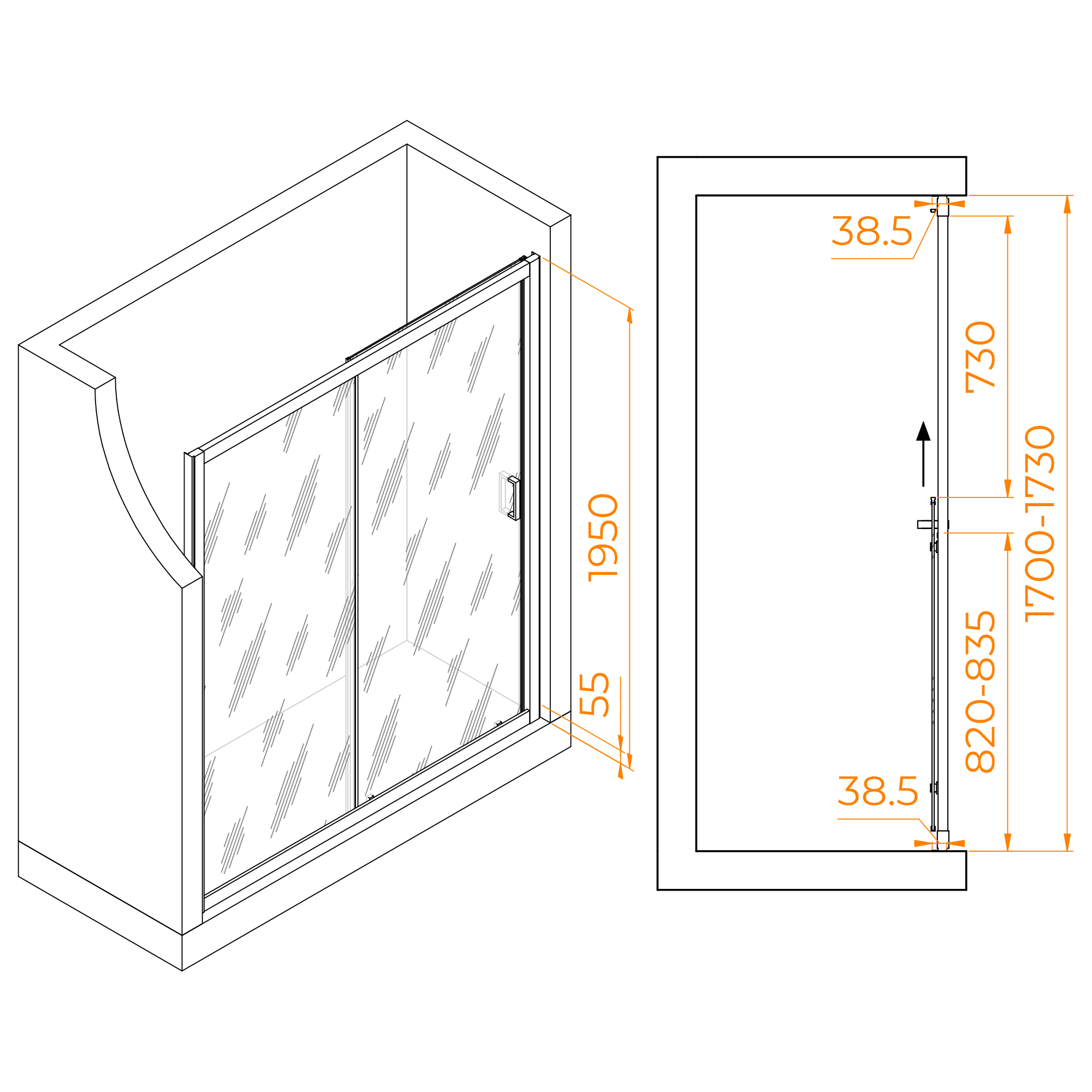 Профиль двери выполнен из анодированного алюминия черного цвета, что придает ей элегантный и современный вид. Высота общая двери составляет 1950 миллиметров. Конструкция дверей раздвижная, что позволяет сэкономить место в ванной комнате.
