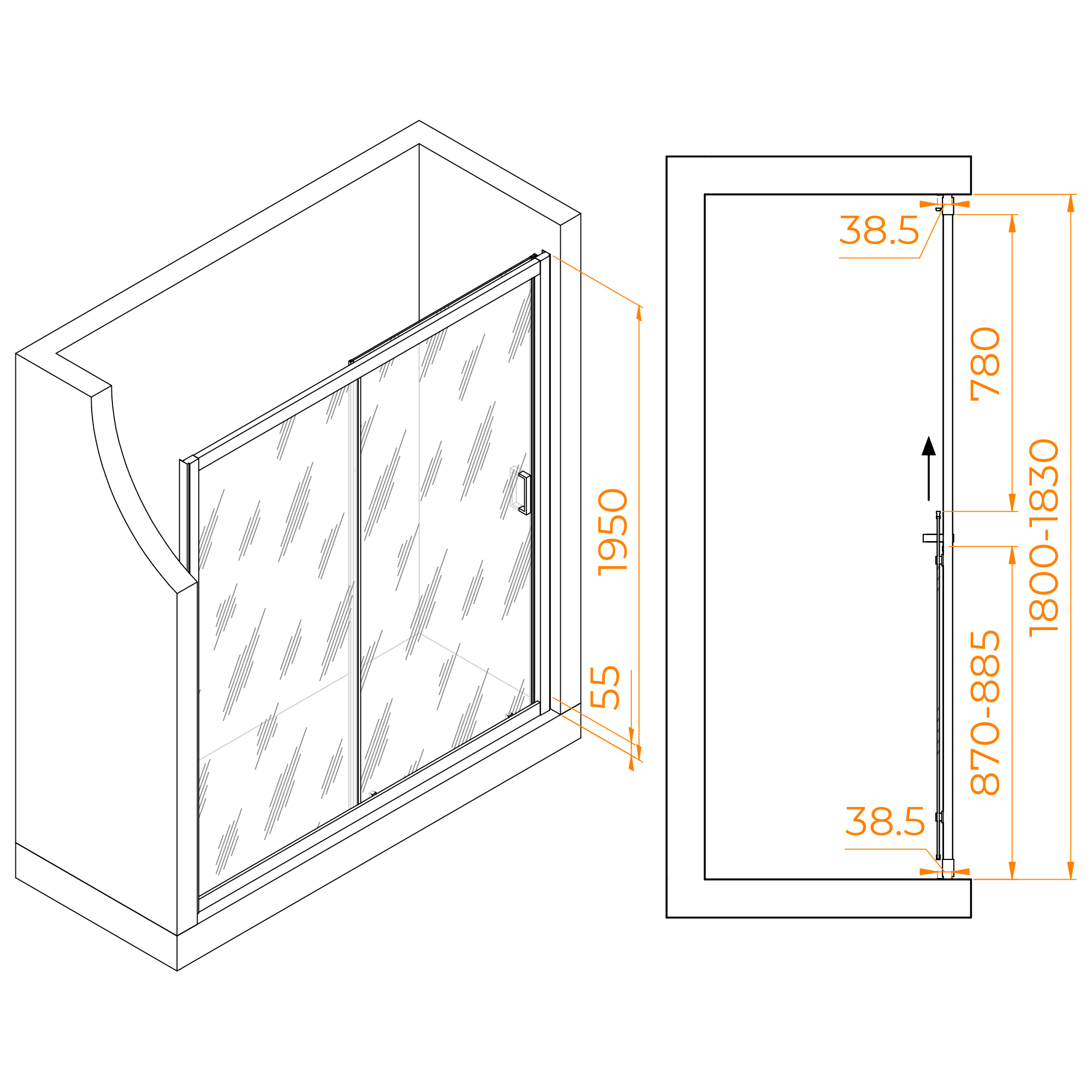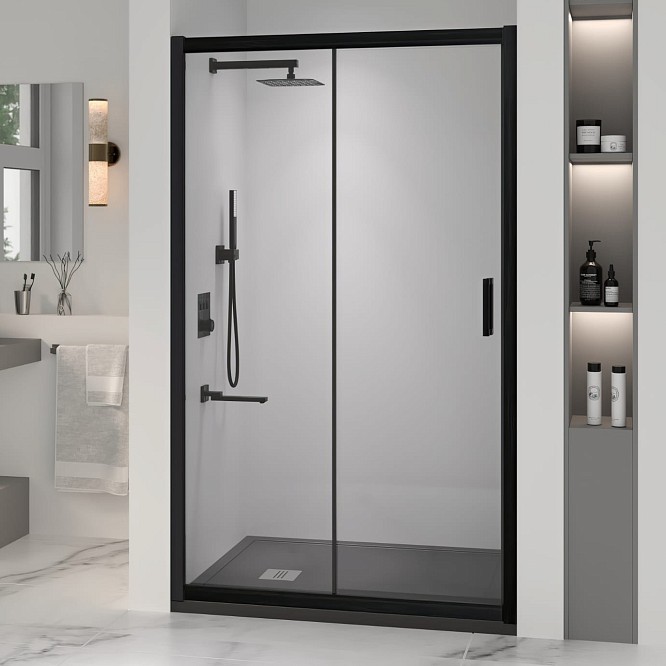 Профиль двери выполнен из анодированного алюминия черного цвета, что придает ей элегантный и современный вид. Высота общая двери составляет 1950 миллиметров. Конструкция дверей раздвижная, что позволяет сэкономить место в ванной комнате.