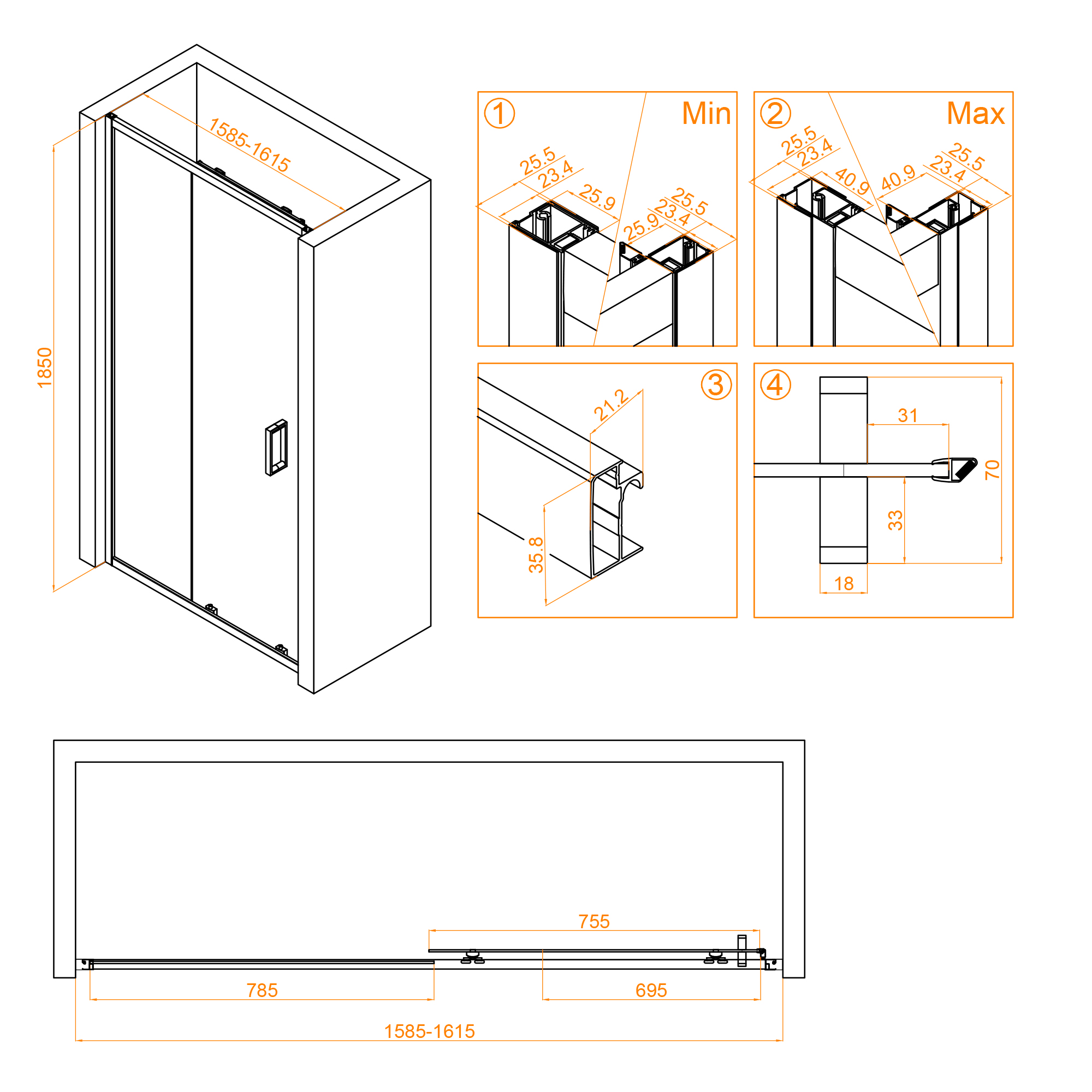 Дверь имеет общую высоту 1850 мм, что подходит для большинства стандартных ванных комнат. Двойные регулируемые ролики обеспечивают плавное и бесшумное открытие и закрытие двери. Благодаря роликовому подшипнику дверь двигается легко и плавно.