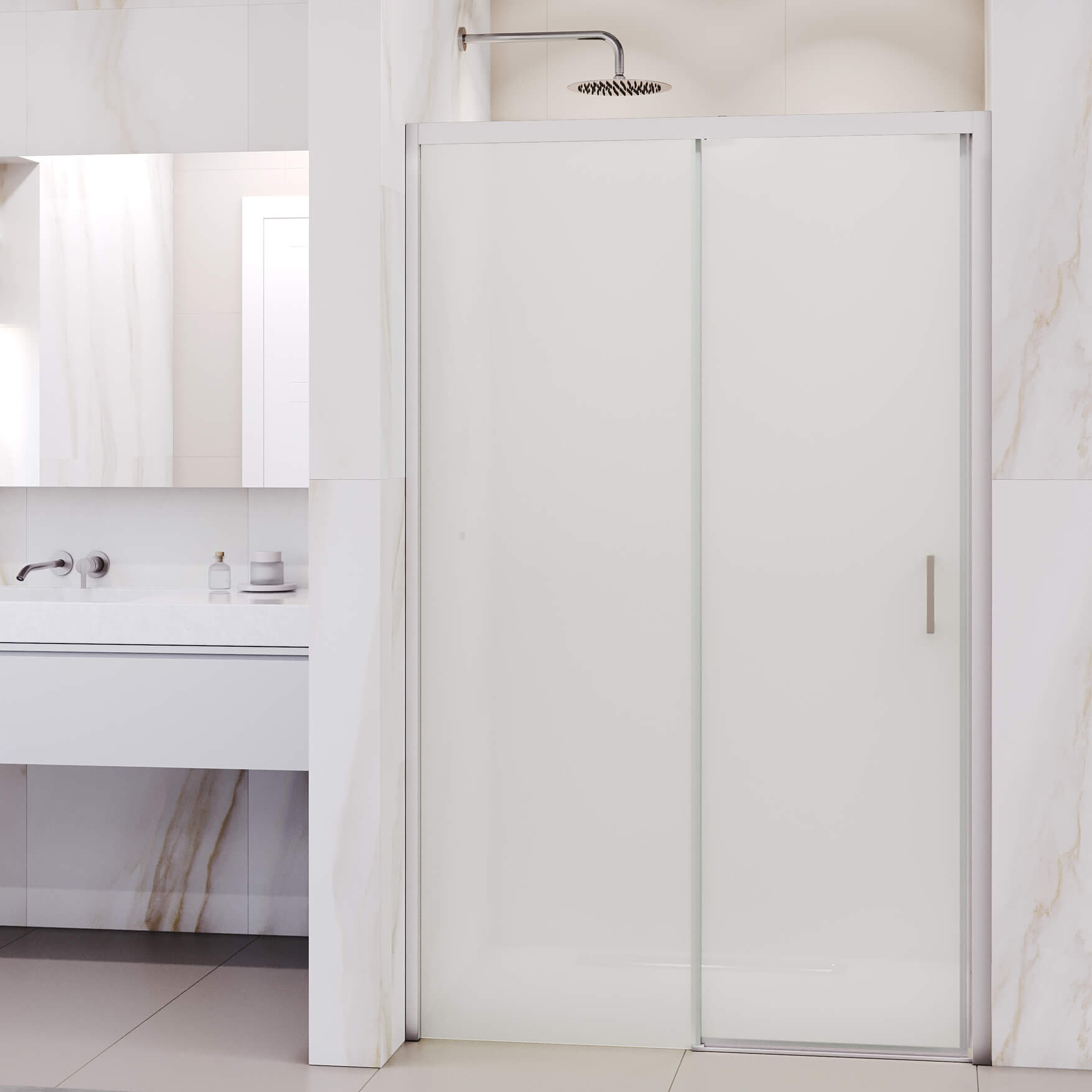 Профиль цвета хром из анодированного алюминия гарантирует прочность и долговечность. Высота двери составляет 1950 мм, а класс утечки 2 предотвращает попадание воды на пол.