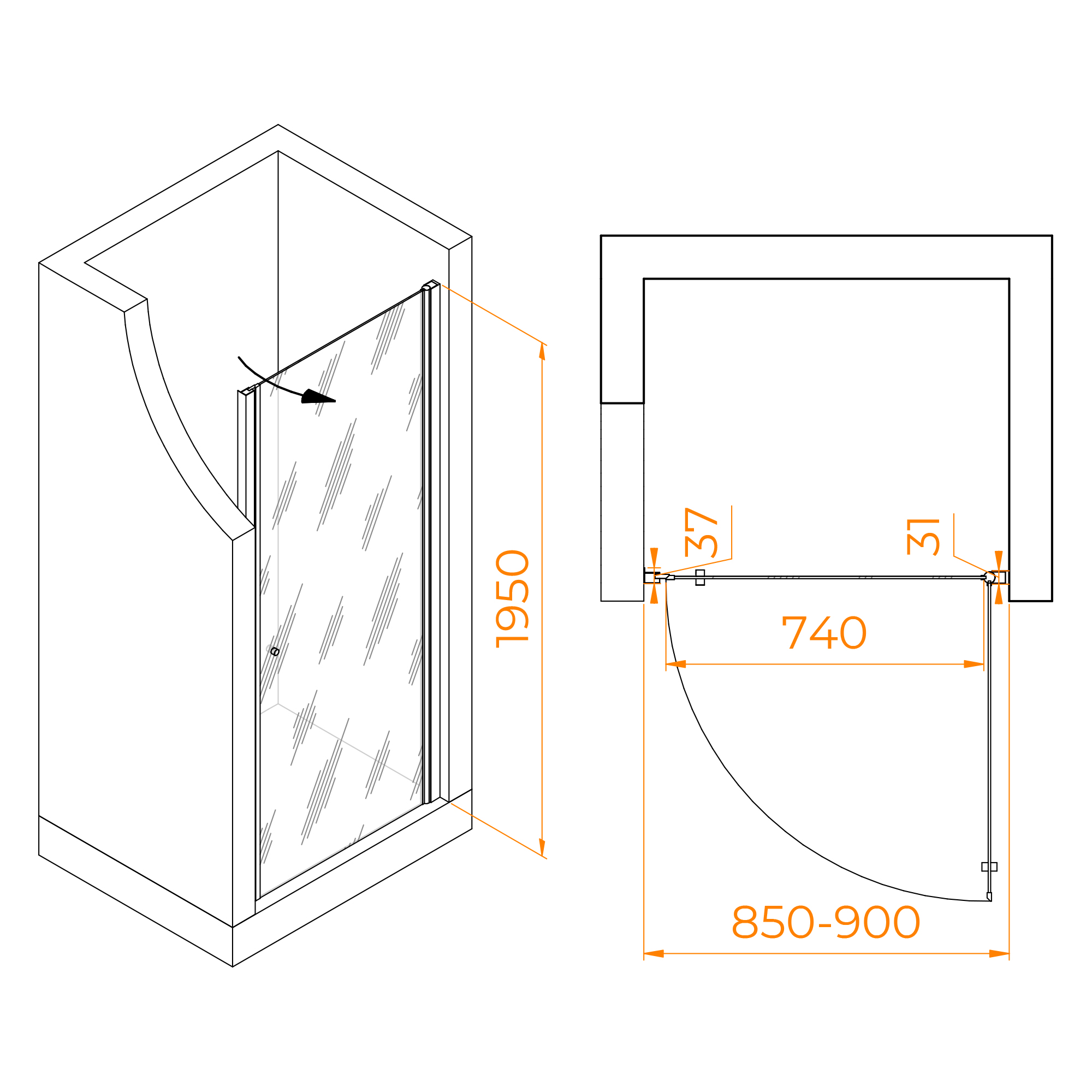 Высокопрочное закаленное стекло обеспечивает безопасность и долговечность двери. Высота двери составляет 1950 мм, что позволяет использовать ее в различных ванных комнатах. Дверь имеет 2 класс герметичности, что обеспечивает защиту от протекания воды и сохраняет сухость внутри душевого помещения.