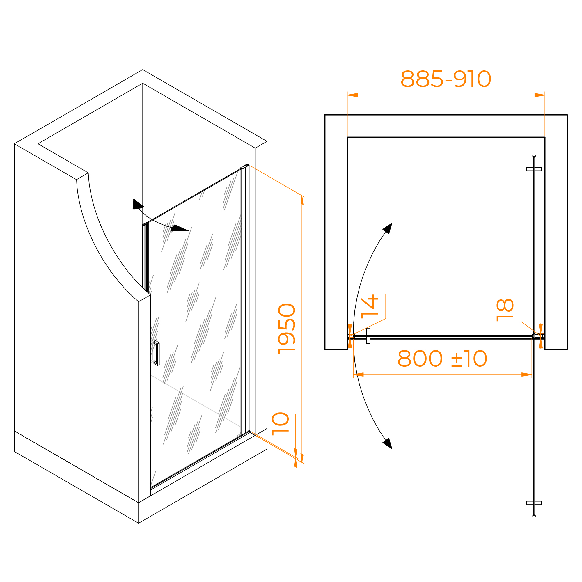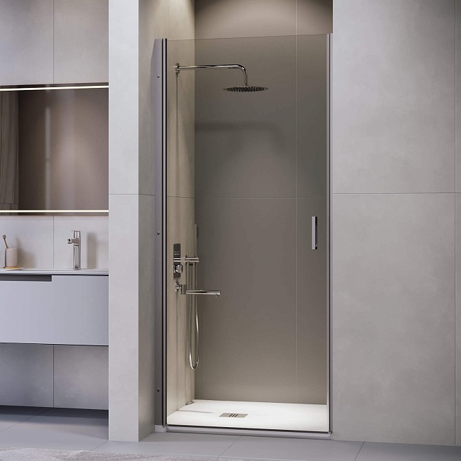Душевая дверь изготовлена из стекла толщиной 6 мм, обеспечивающего превосходную прочность и долговечность. Прозрачный цвет стекла создает современный и открытый вид, а серый цвет профиля добавляет нотку элегантности. Общая высота двери составляет 1950 мм, что делает ее подходящей для большинства стандартных душевых кабин.