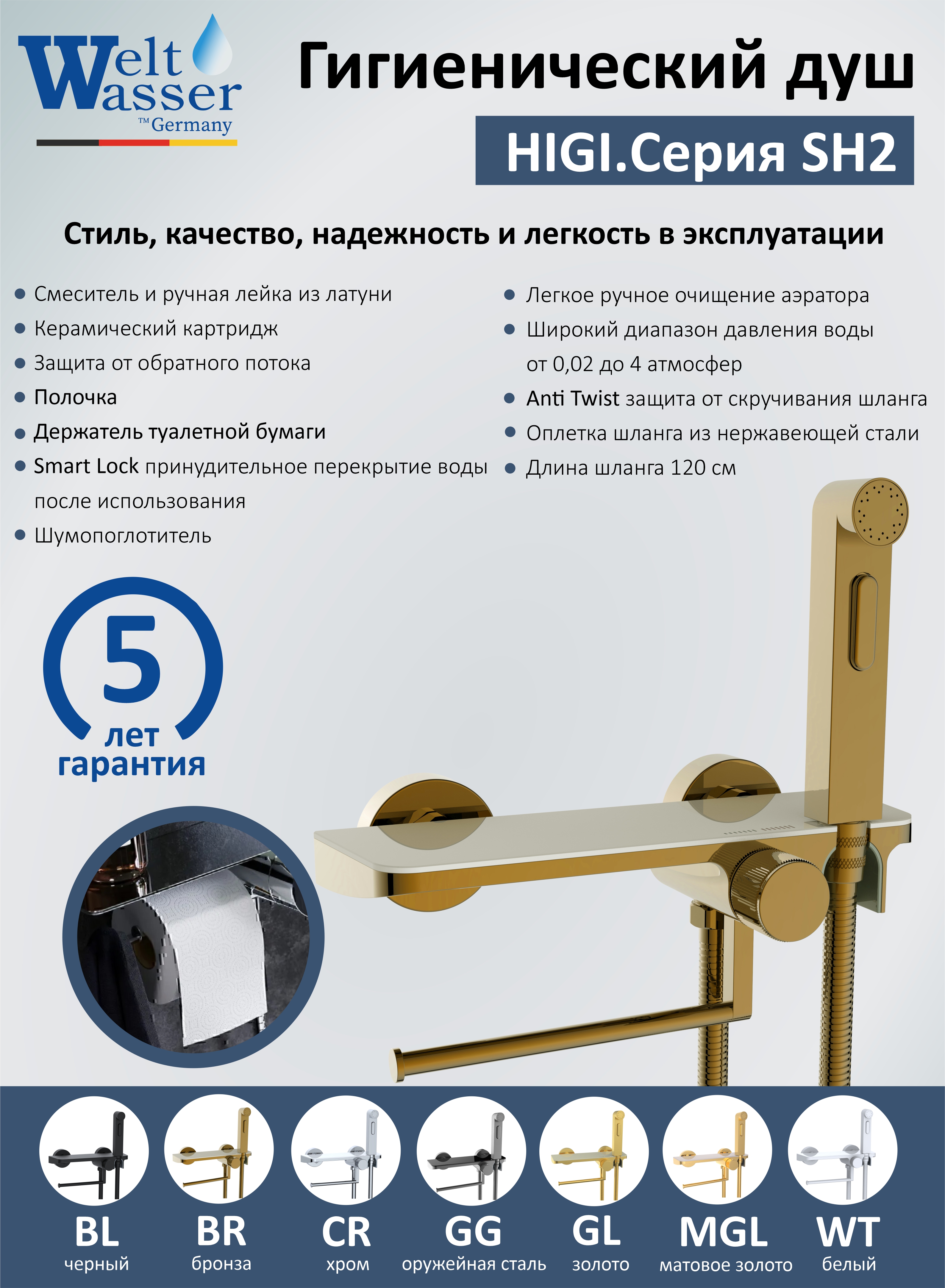 Гигиенический душ WeltWasser Higi SH2 MGL с полкой и держателем золото матовое 10000013684