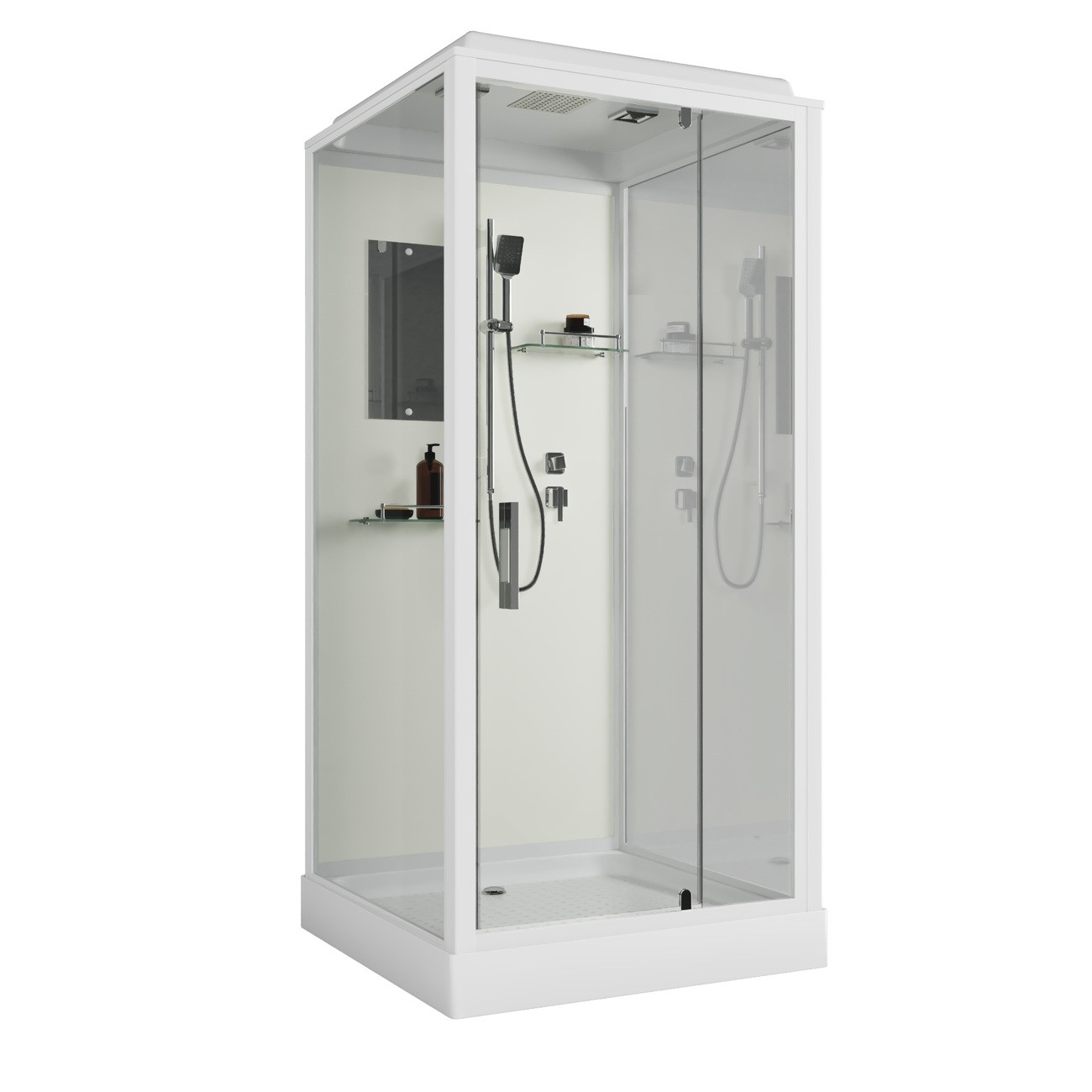 | Оснащение | Верхний душ, душевой гарнитур, смеситель, 2 полочки, зеркало, вентиляция |