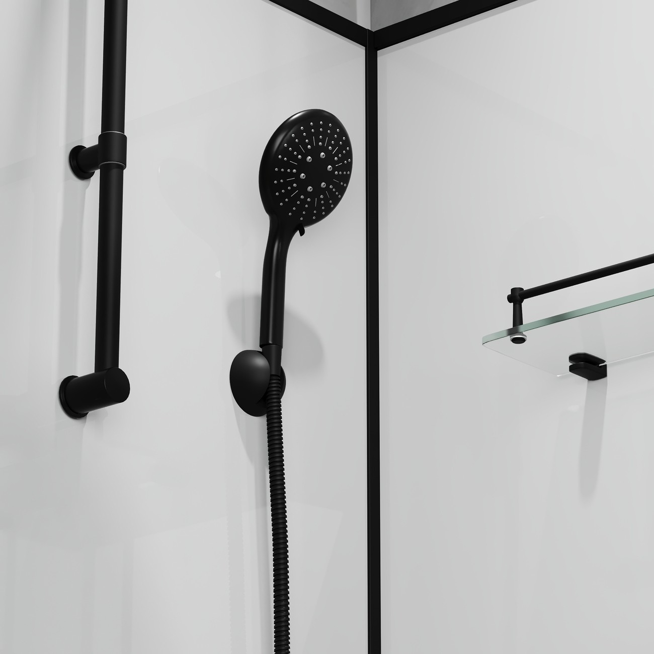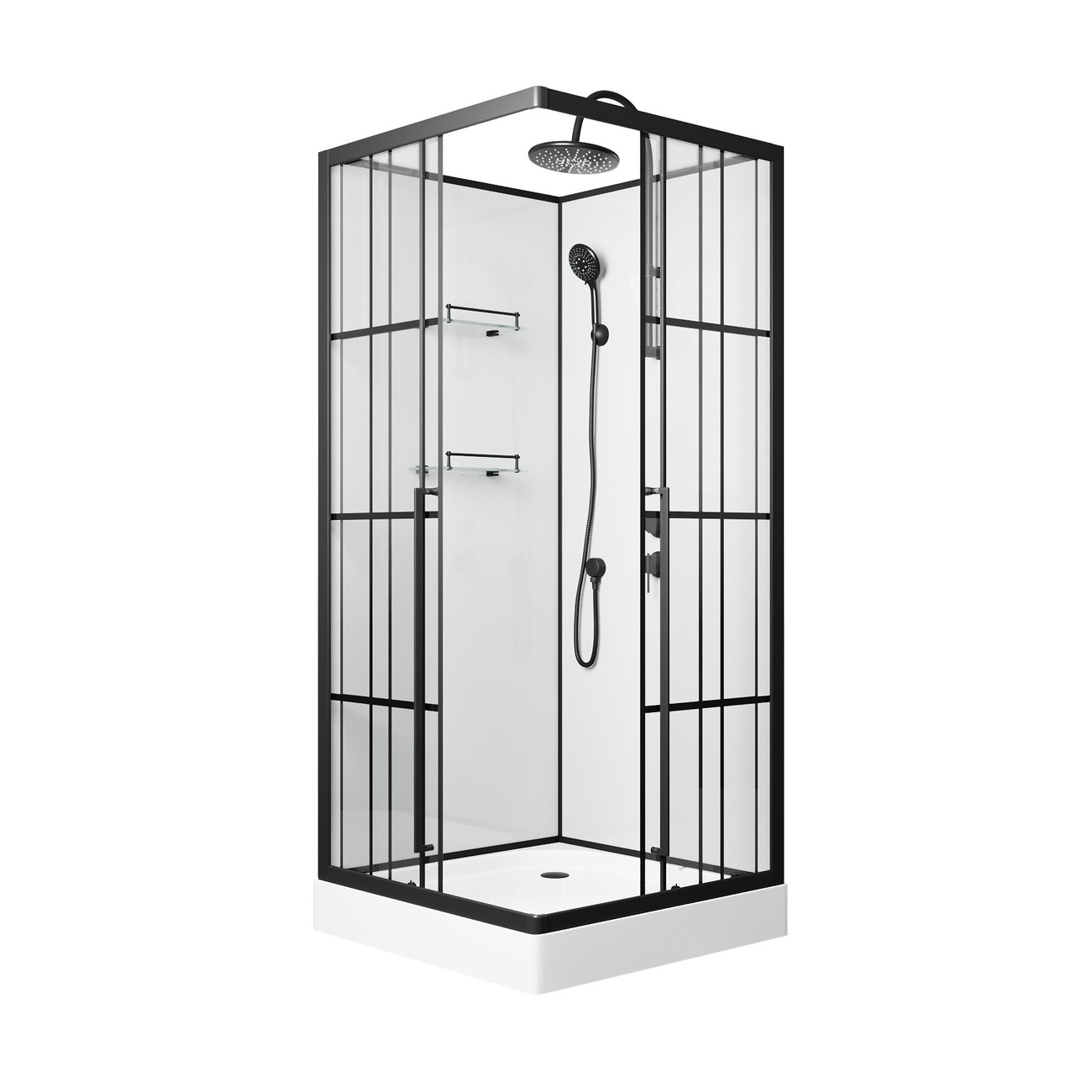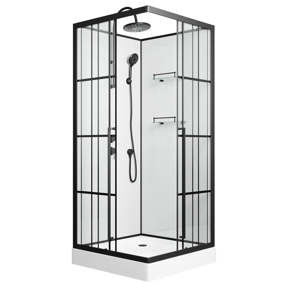 | Оснащение | Верхний душ, душевой гарнитур, смеситель, 2 полочки |