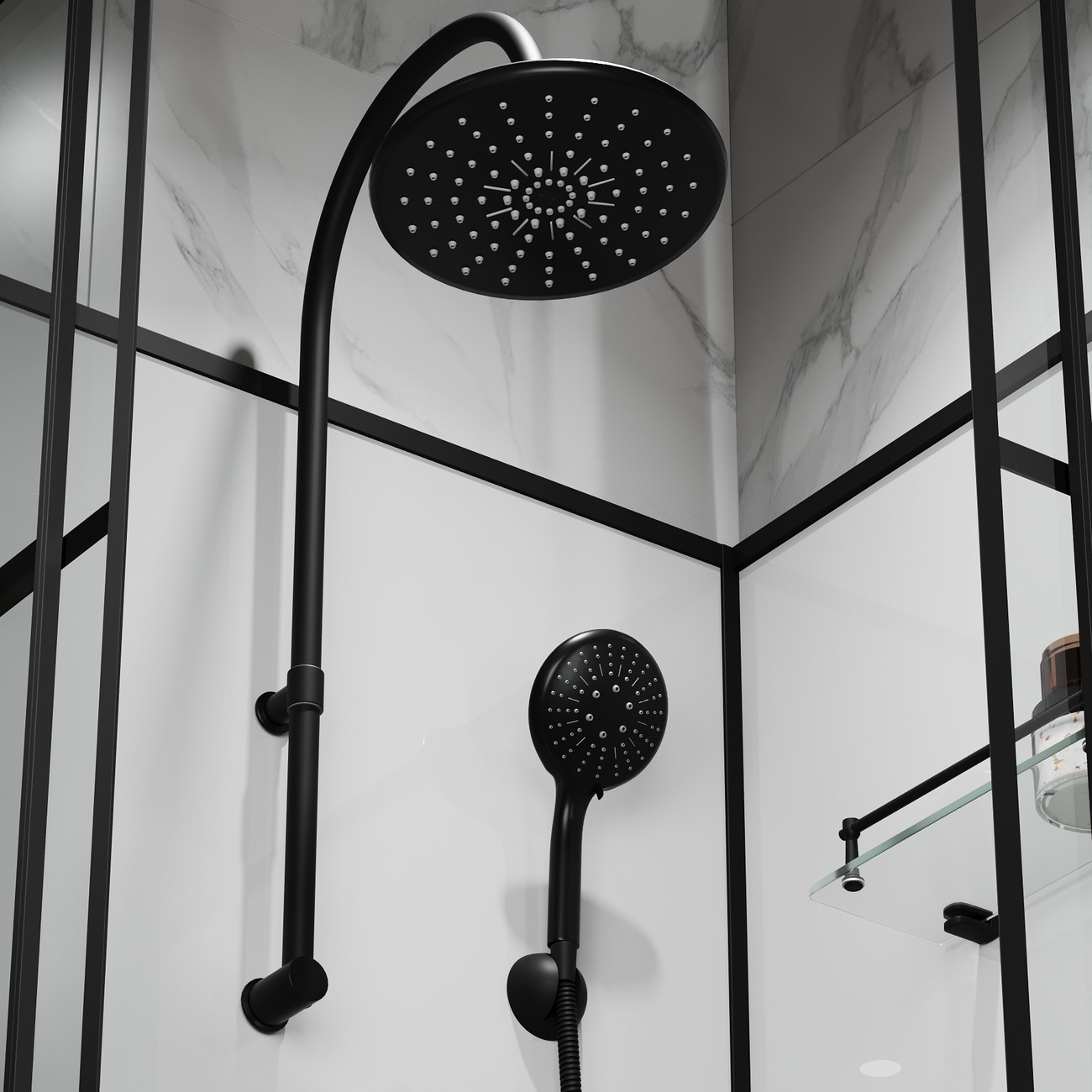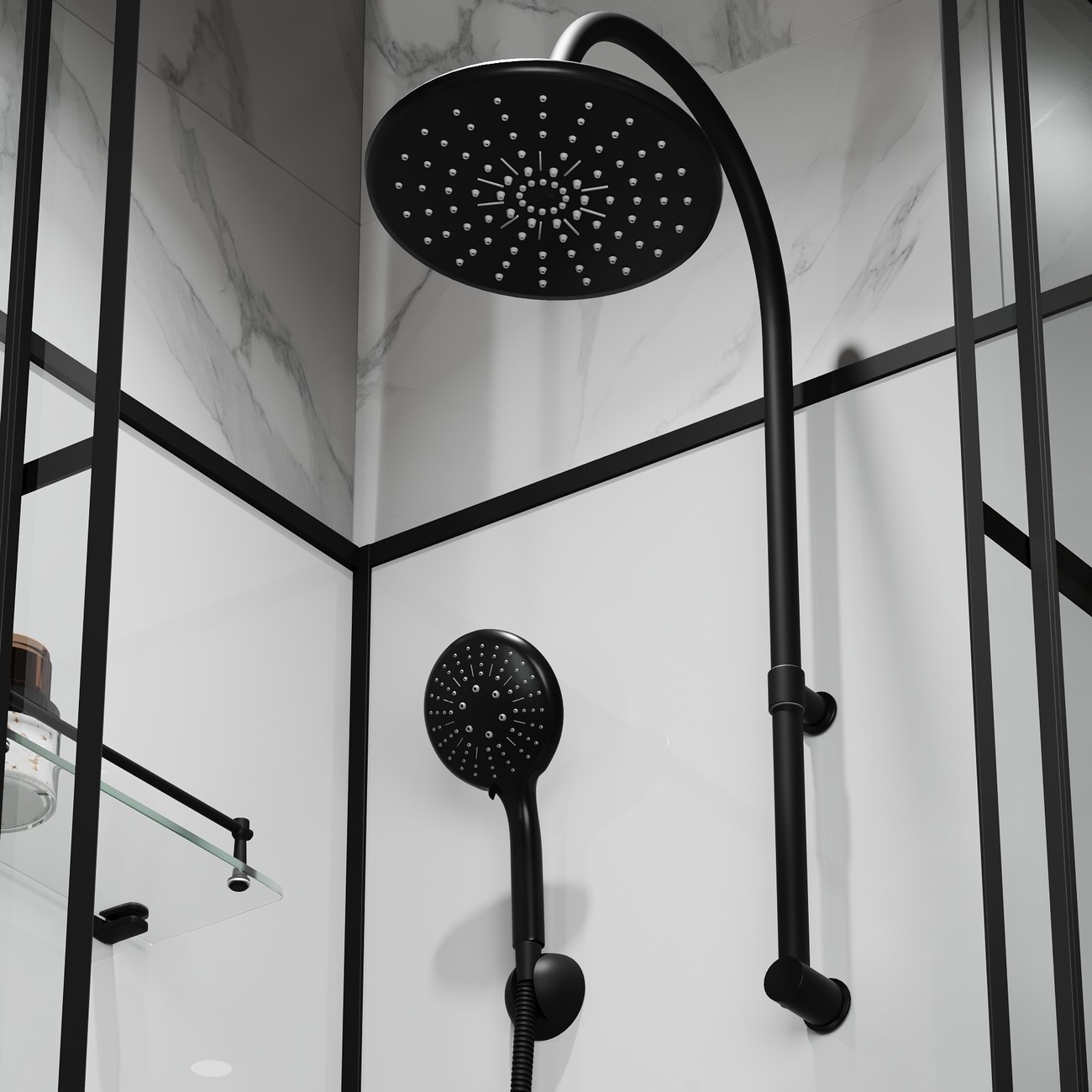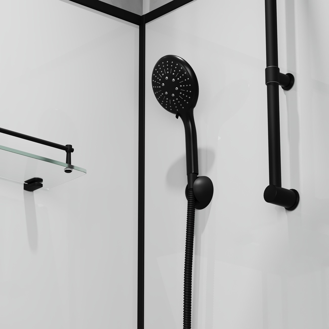 | Оснащение | Верхний душ, душевой гарнитур, смеситель, 2 полочки |