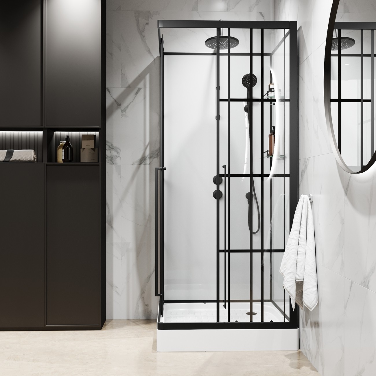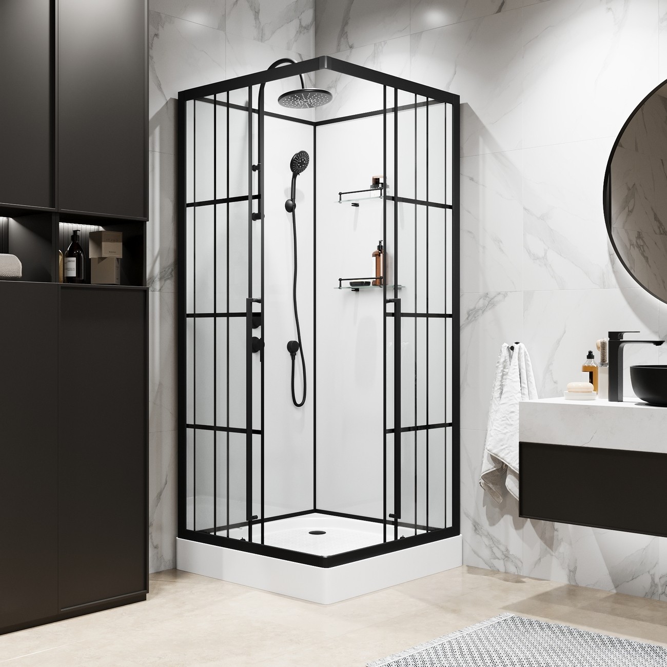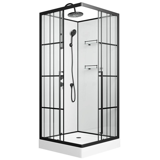 | Оснащение | Верхний душ, душевой гарнитур, смеситель, 2 полочки |