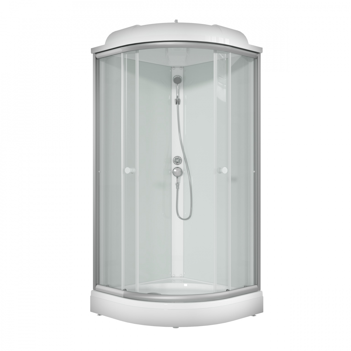 Комплектация: Поддон, сифон, панель, 4 профиля, 2 передние неподвижные стенки, 2 двери, 2 задние стенки, ручки, 4 ролика одноколесные, центральная панель, смеситель. крыша.
