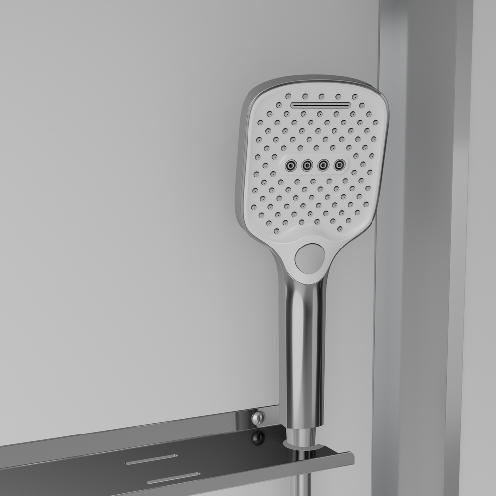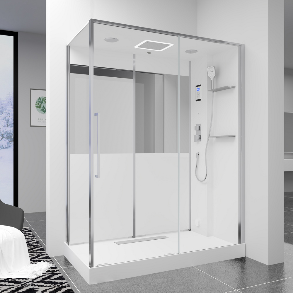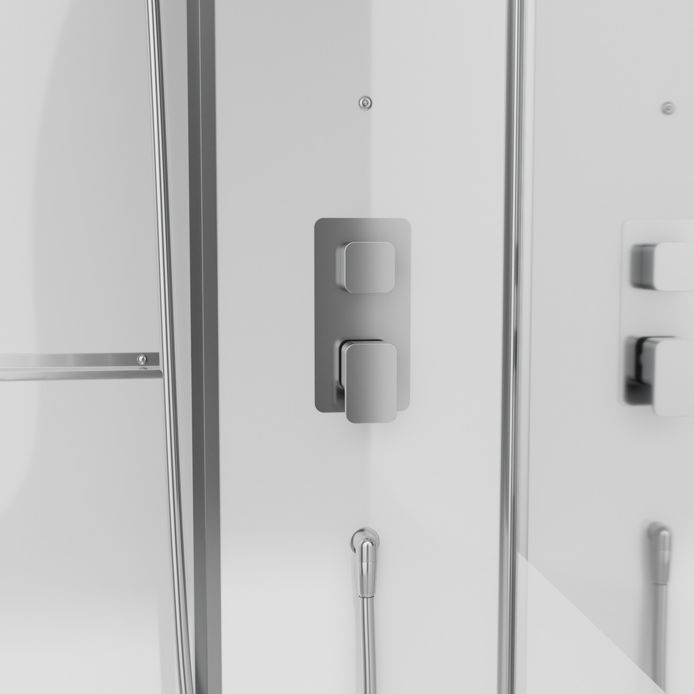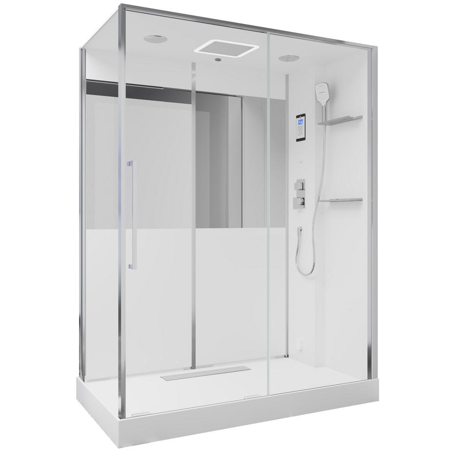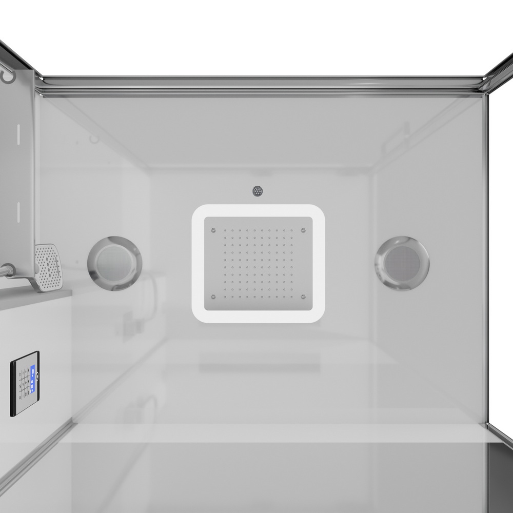 В комплекте парогенератор, душевой гарнитур, LED-подсветка, bluetooth, вентиляция, радио, озонирование, тропический (верхний) душ, полочки.