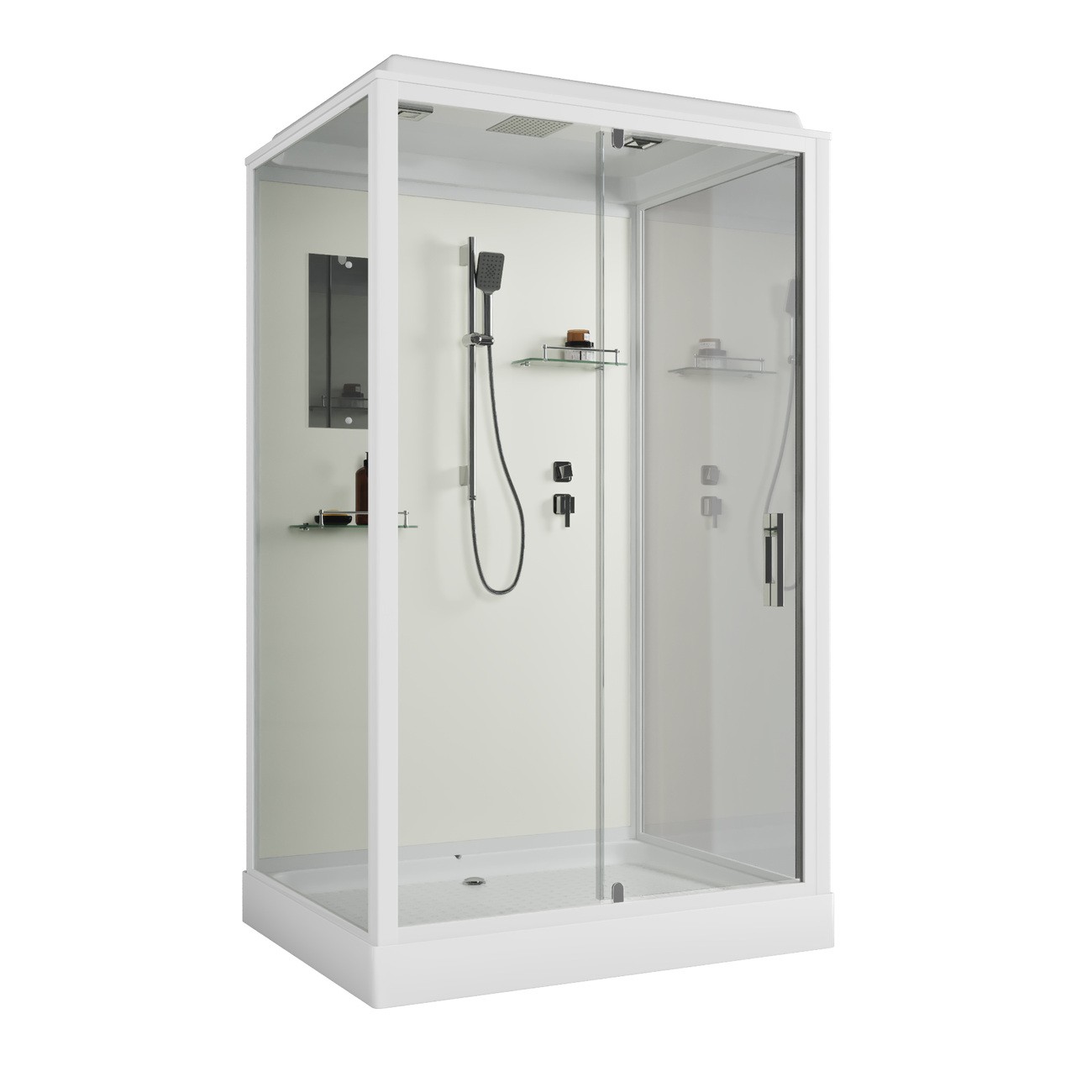 | Оснащение | Верхний душ, душевой гарнитур, смеситель, 2 полочки, зеркало, вентиляция |