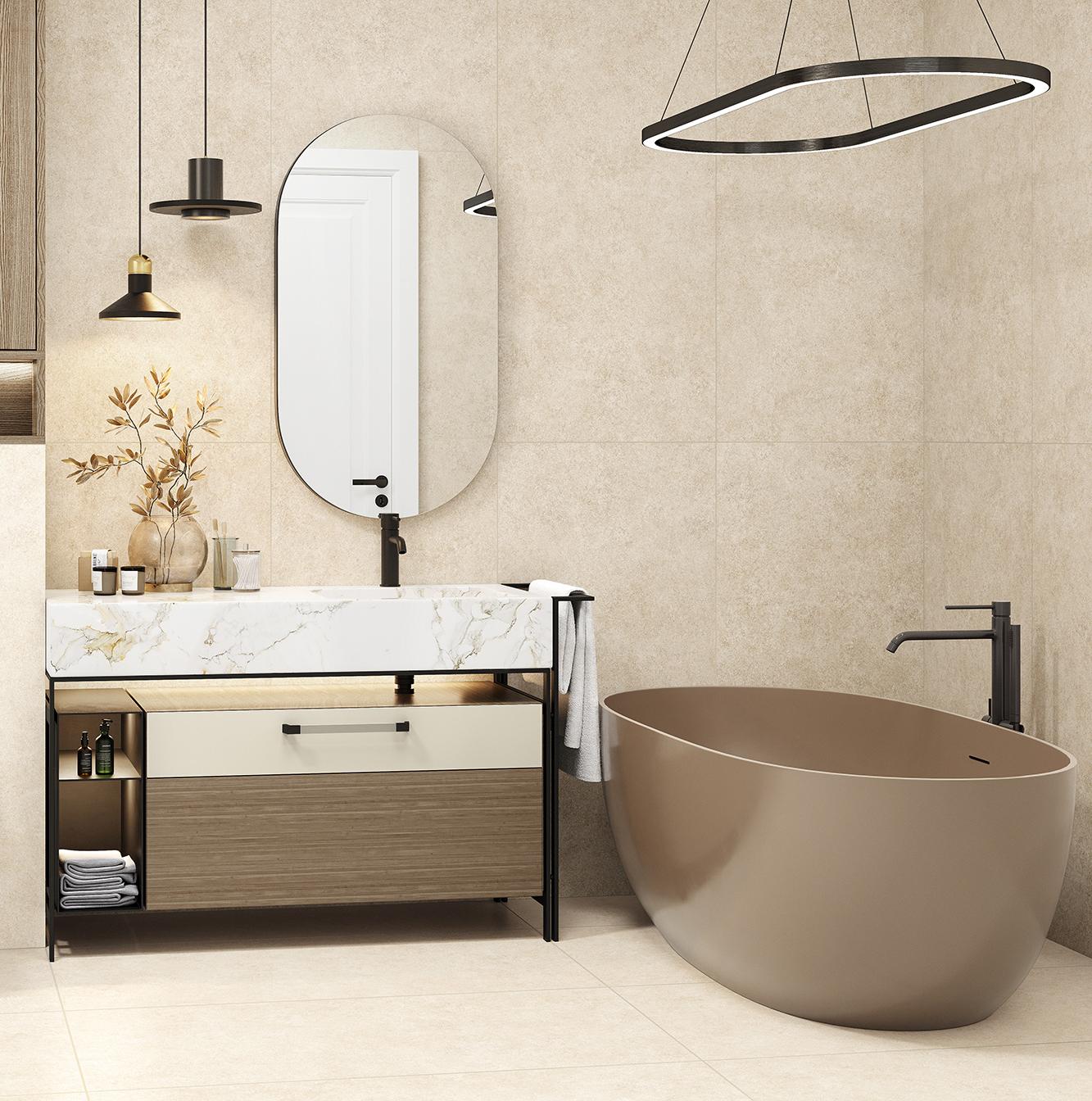 В коллекции Amsterdam популярная текстура бетона представлена пятью вариантами, в теплой и в холодной гамме. Артикулы могут использоваться самостоятельно как стильное, практически однородное напольное покрытие с популярной разбежкой плит на 1/3 или использовать укладку без смещения. С таким материалом возможно воплотить в жизнь и оригинальные дизайнерские решения, в виде сочетаний крупноформатного мрамора или бетона с керамогранитной доской 200х900 мм, разделяя помещения или выделяя функциональные зоны в санузле.