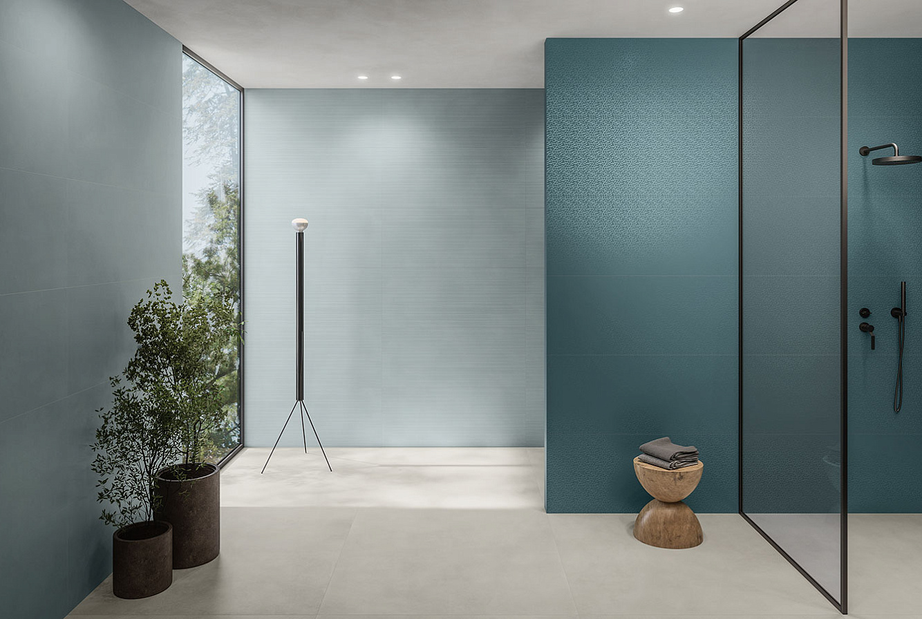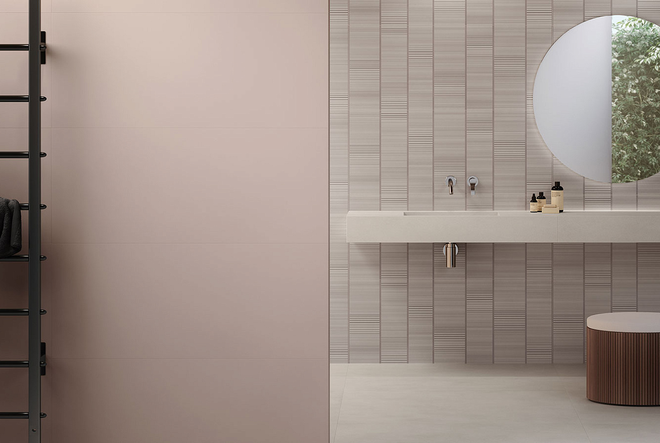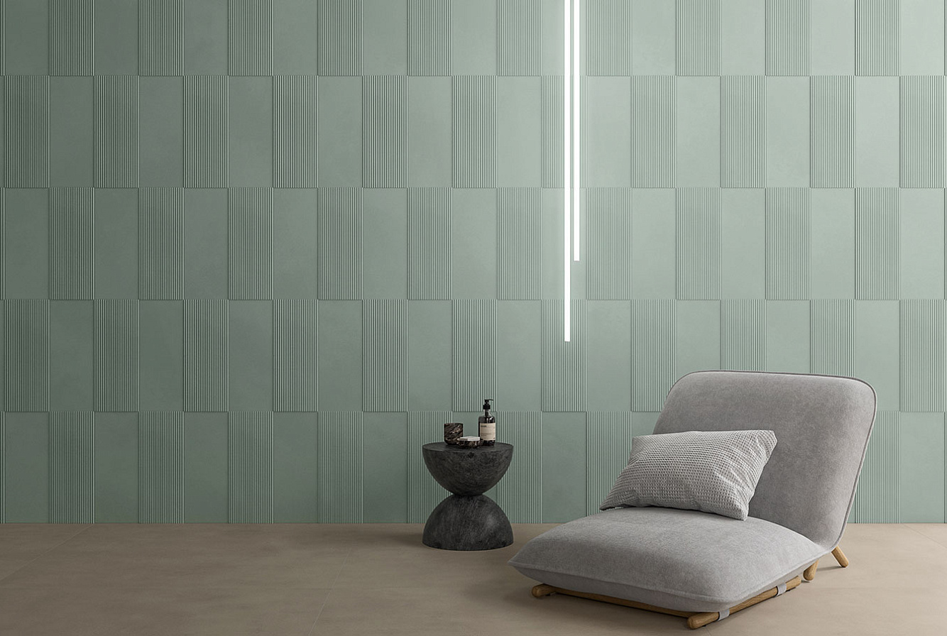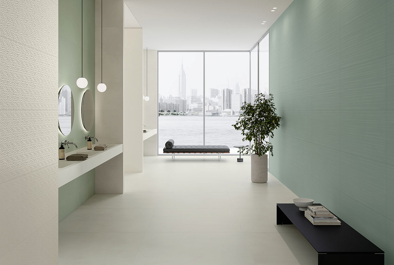 Керамическая плитка для стен предлагается в формате 50х120 см и доступна в 14 оттенках: Pure, Moon, Dove, Linen, Mauve, Pebble, Cream, Sun, Salix, Mint, Jade, Teal, Iris и Navy.