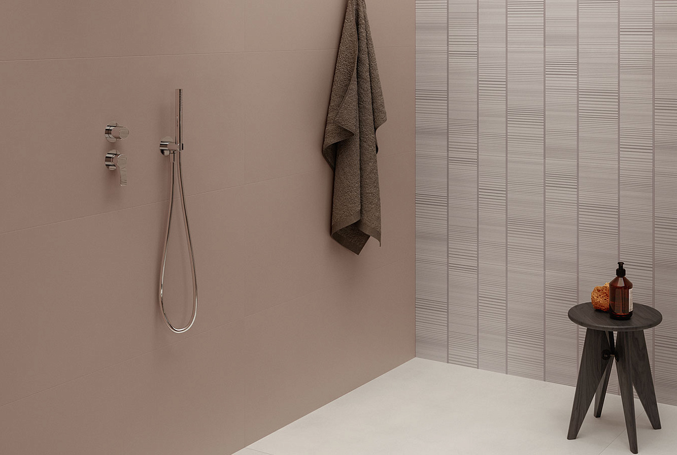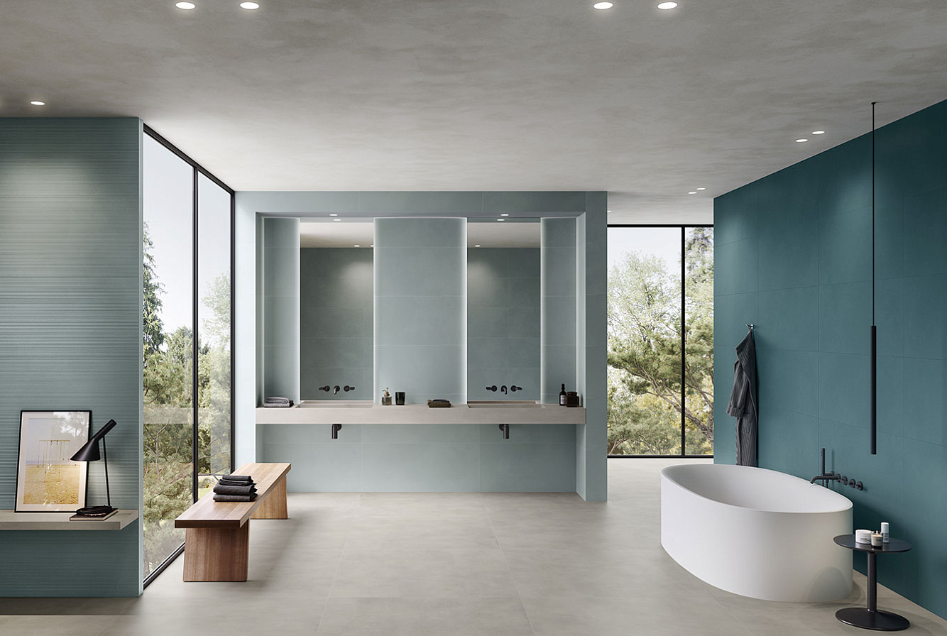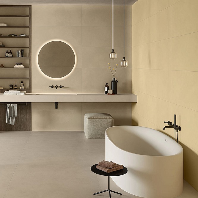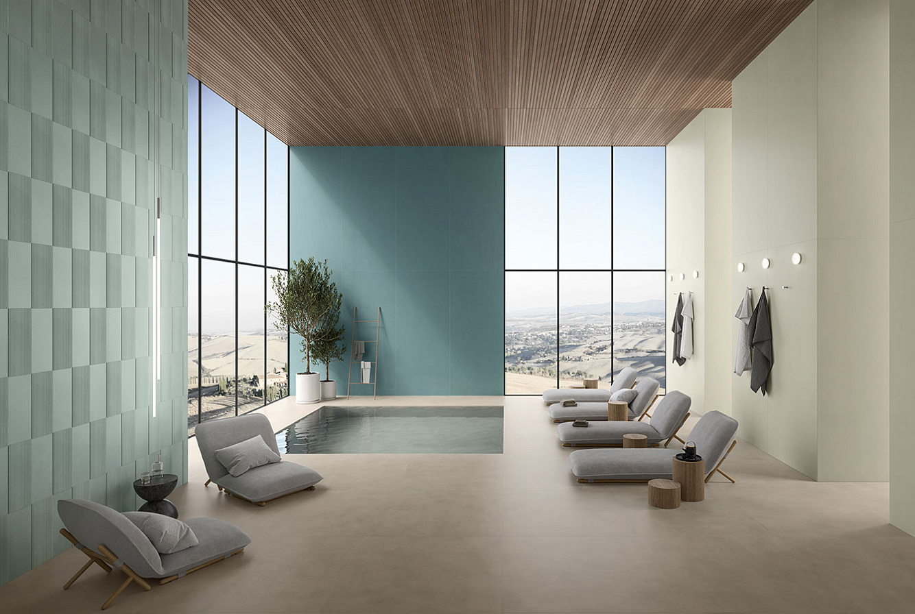 Керамическая плитка для стен предлагается в формате 50х120 см и доступна в 14 оттенках: Pure, Moon, Dove, Linen, Mauve, Pebble, Cream, Sun, Salix, Mint, Jade, Teal, Iris и Navy.