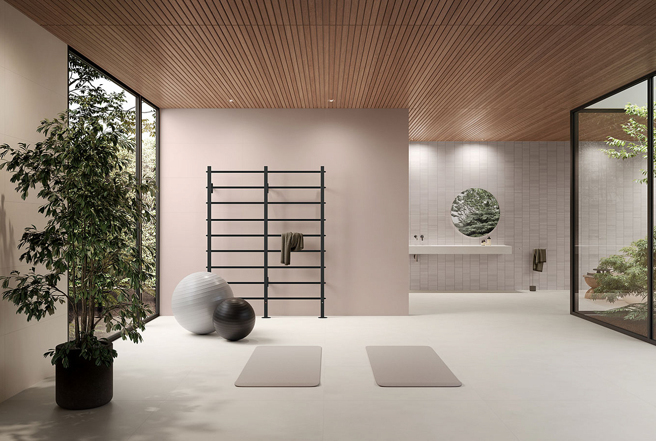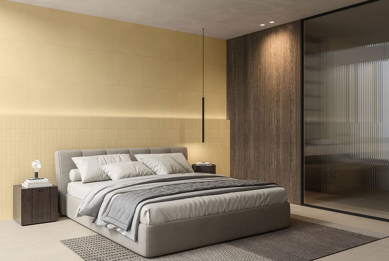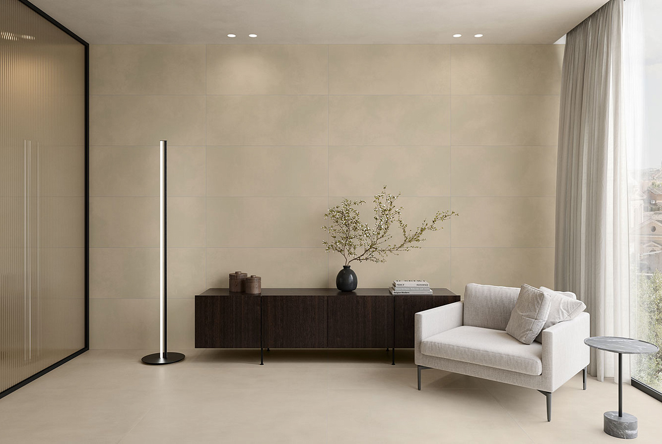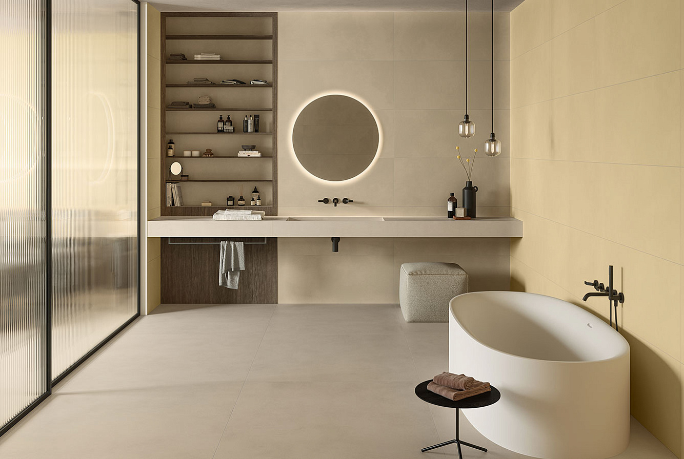 Керамическая плитка для стен предлагается в формате 50х120 см и доступна в 14 оттенках: Pure, Moon, Dove, Linen, Mauve, Pebble, Cream, Sun, Salix, Mint, Jade, Teal, Iris и Navy.