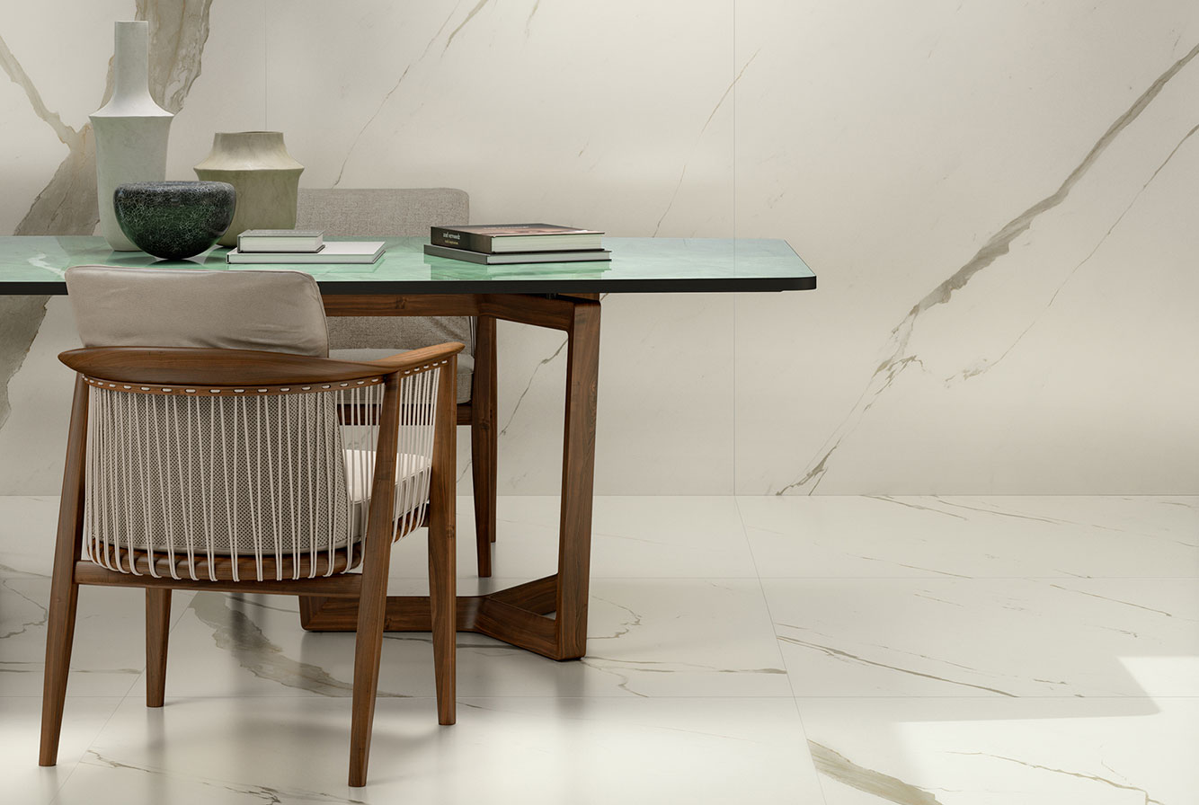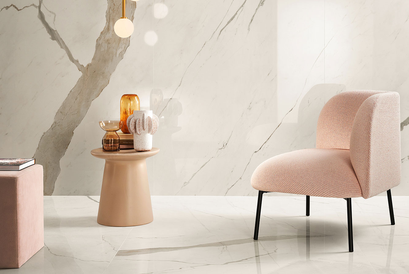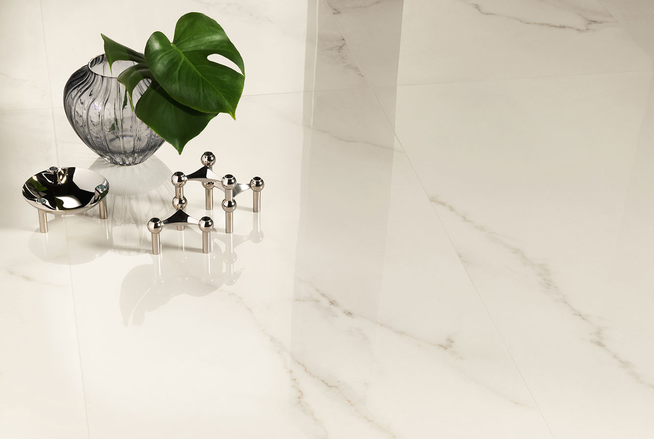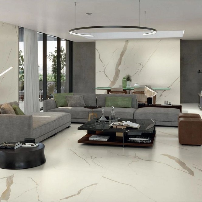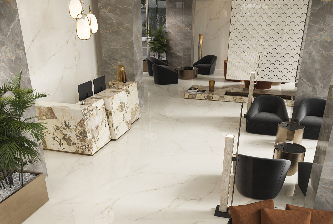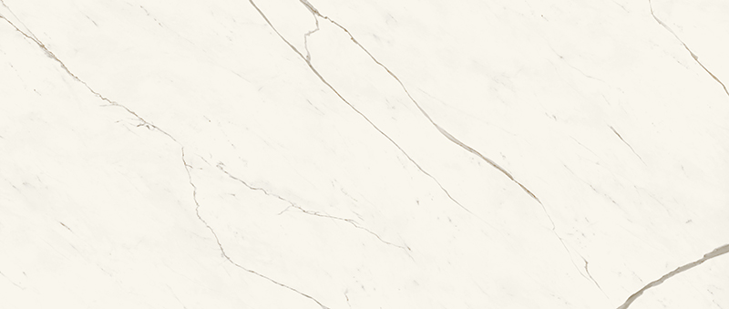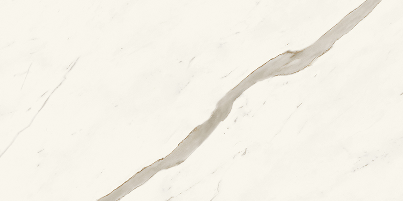 Calacatta Sublime - имитирует ценные плиты мрамора Calacatta с чистым, ярко-белым фоном и небольшими теплыми пятнами и прожилками.