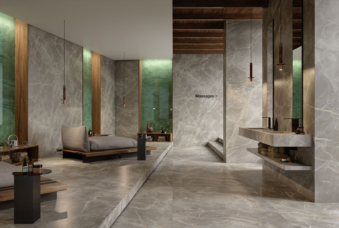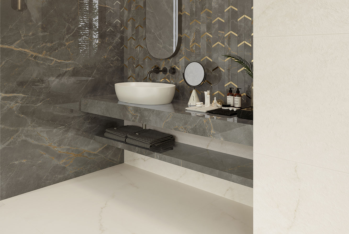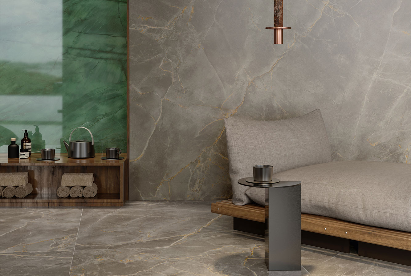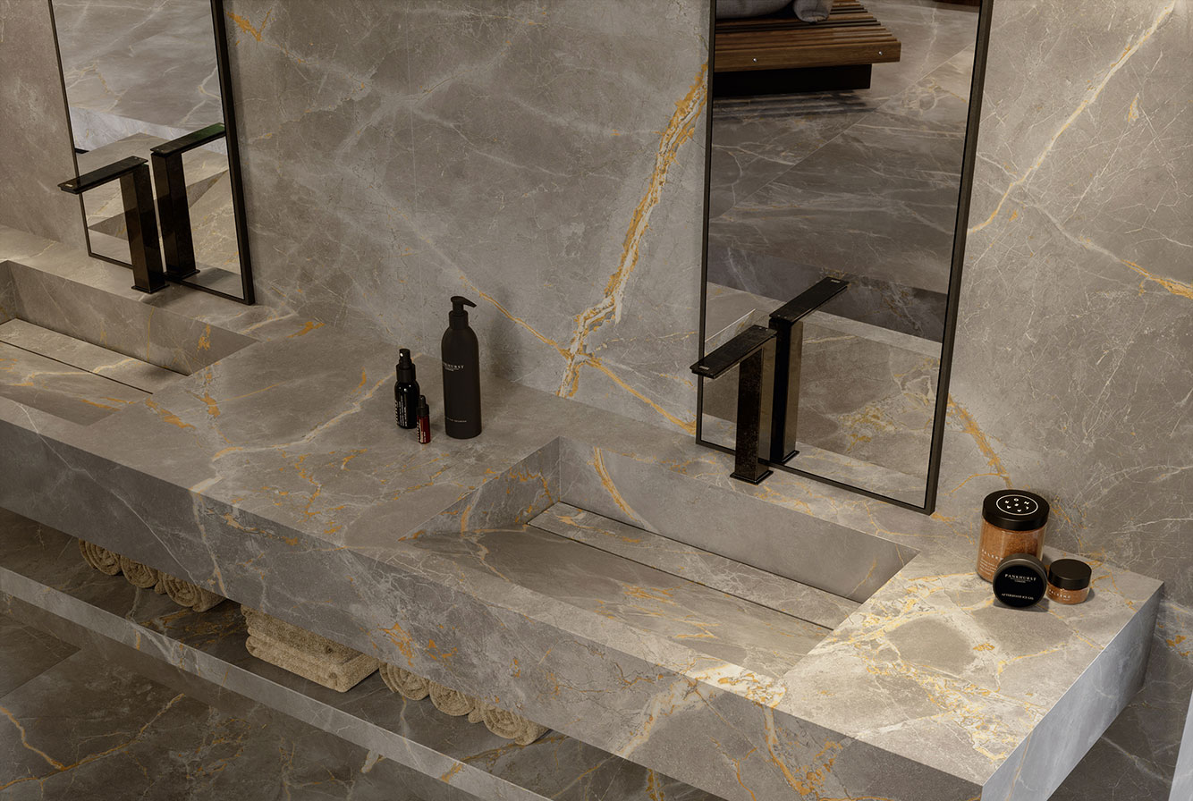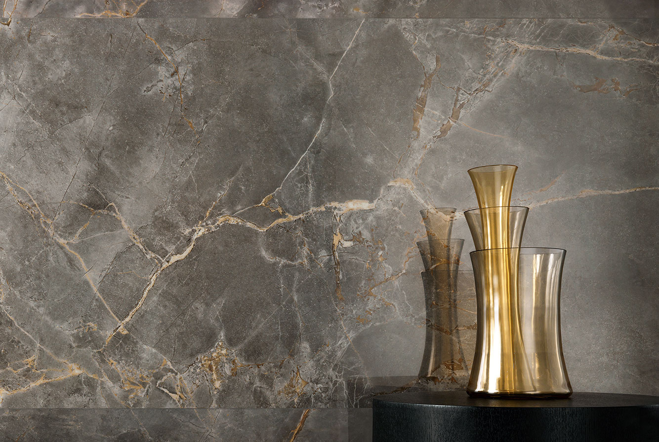Fior di Bosco - имитирует тосканский мрамор, серого насыщенного цвета с четкими золотистыми прожилками, придающими материалу яркую индивидуальность. Лаппатированная поверхность раскрывает богатство и глубину деталей, матовая и Hammered подчеркивают натуральный вид камня.