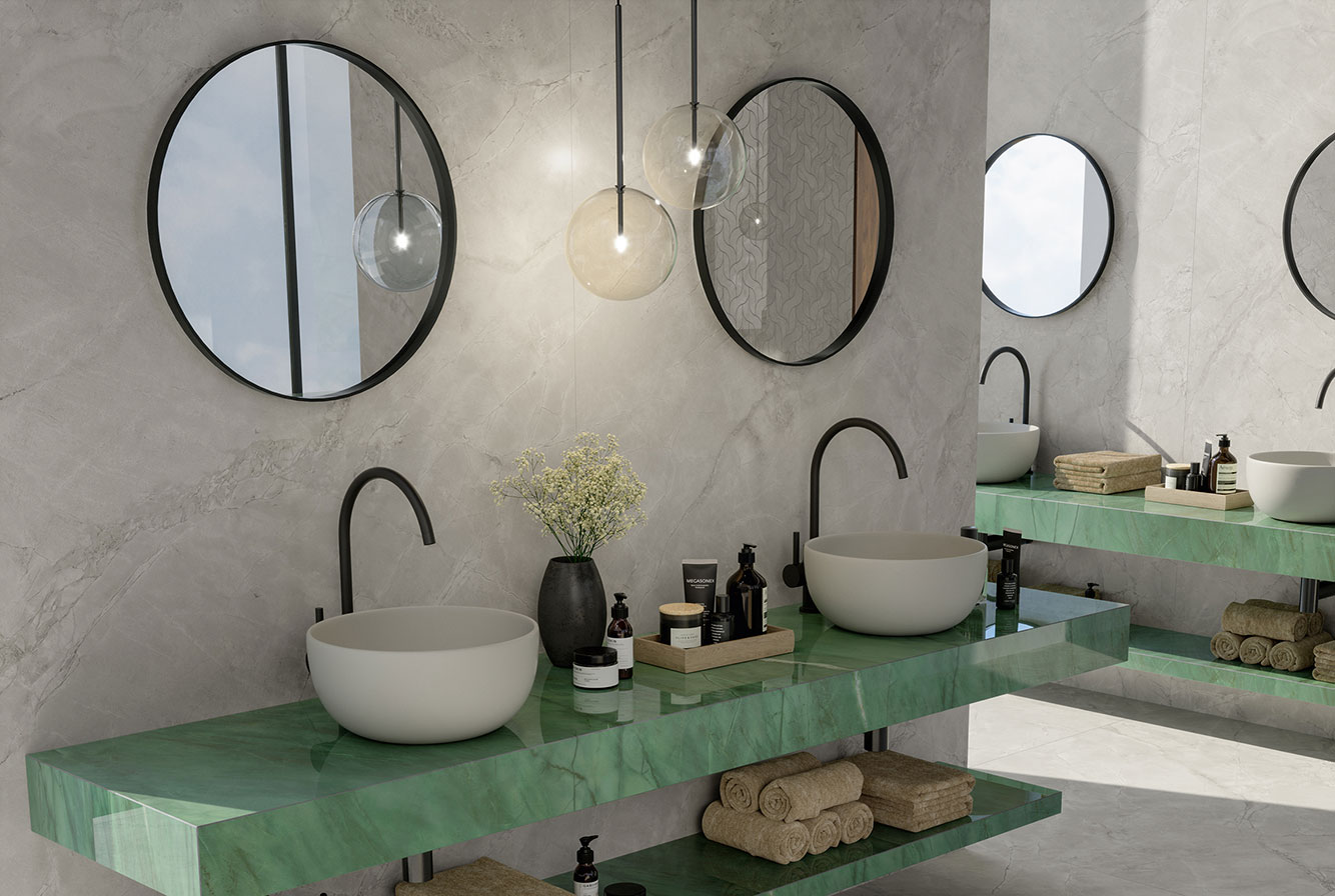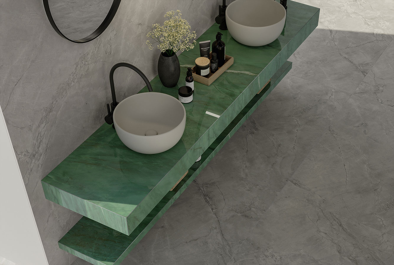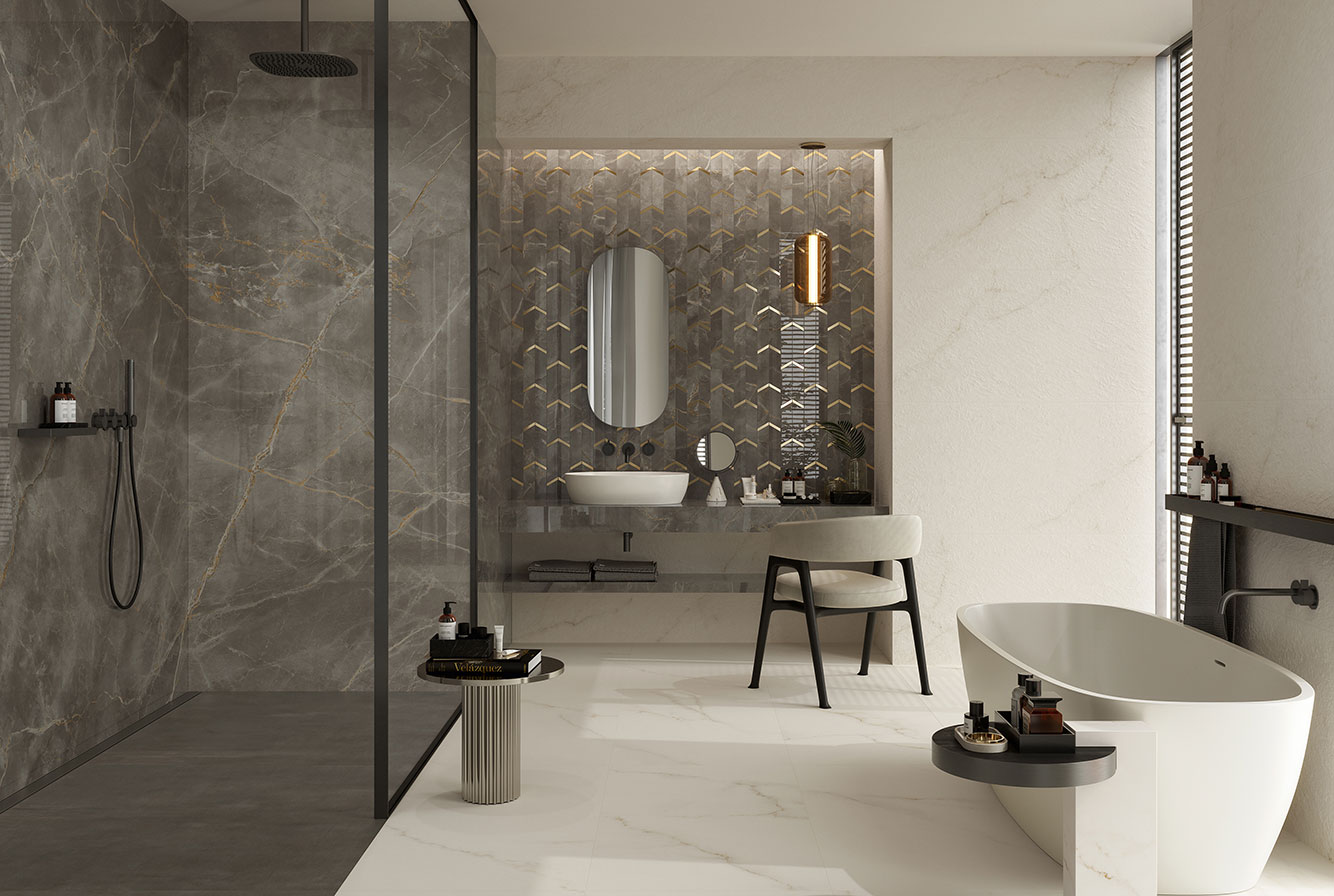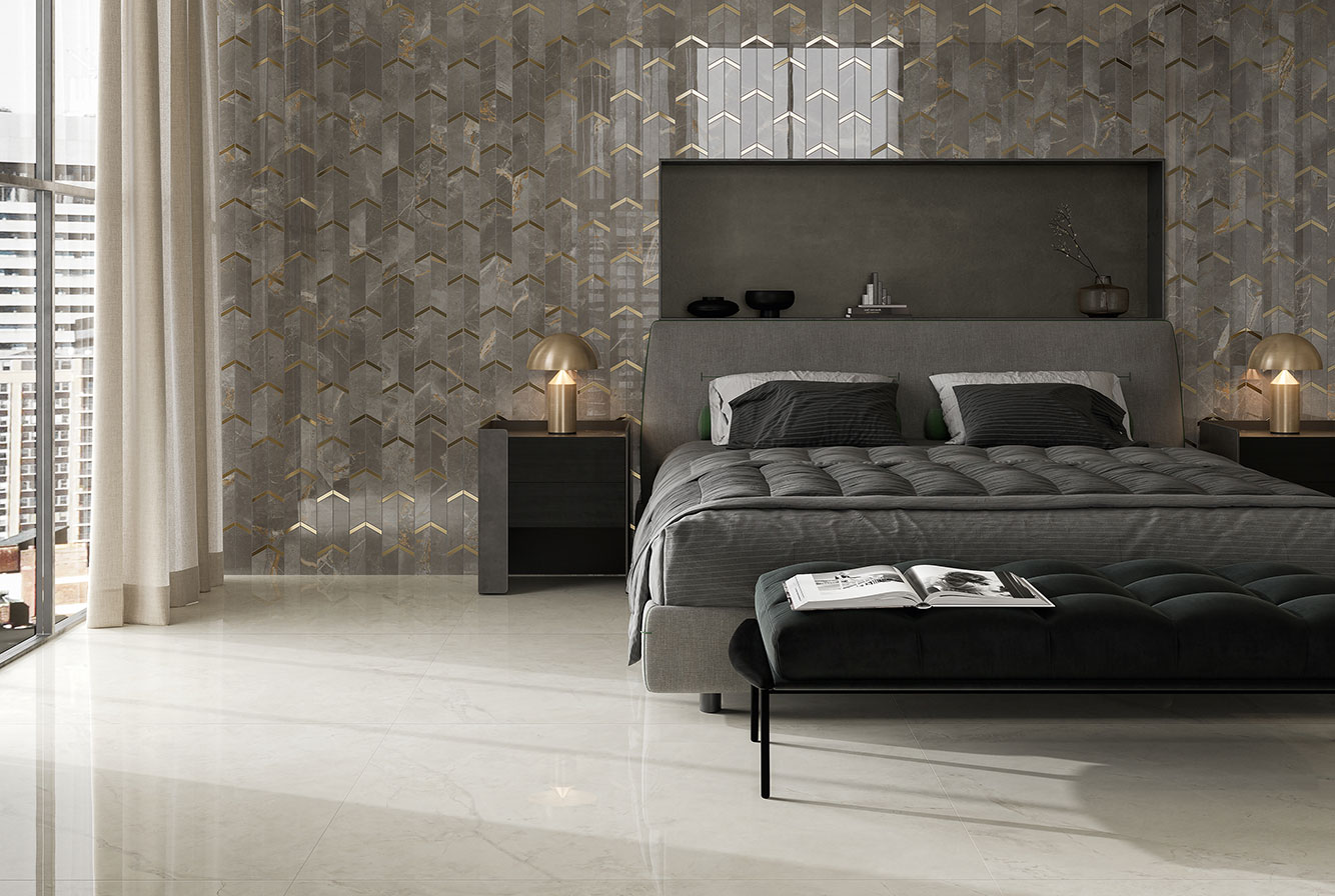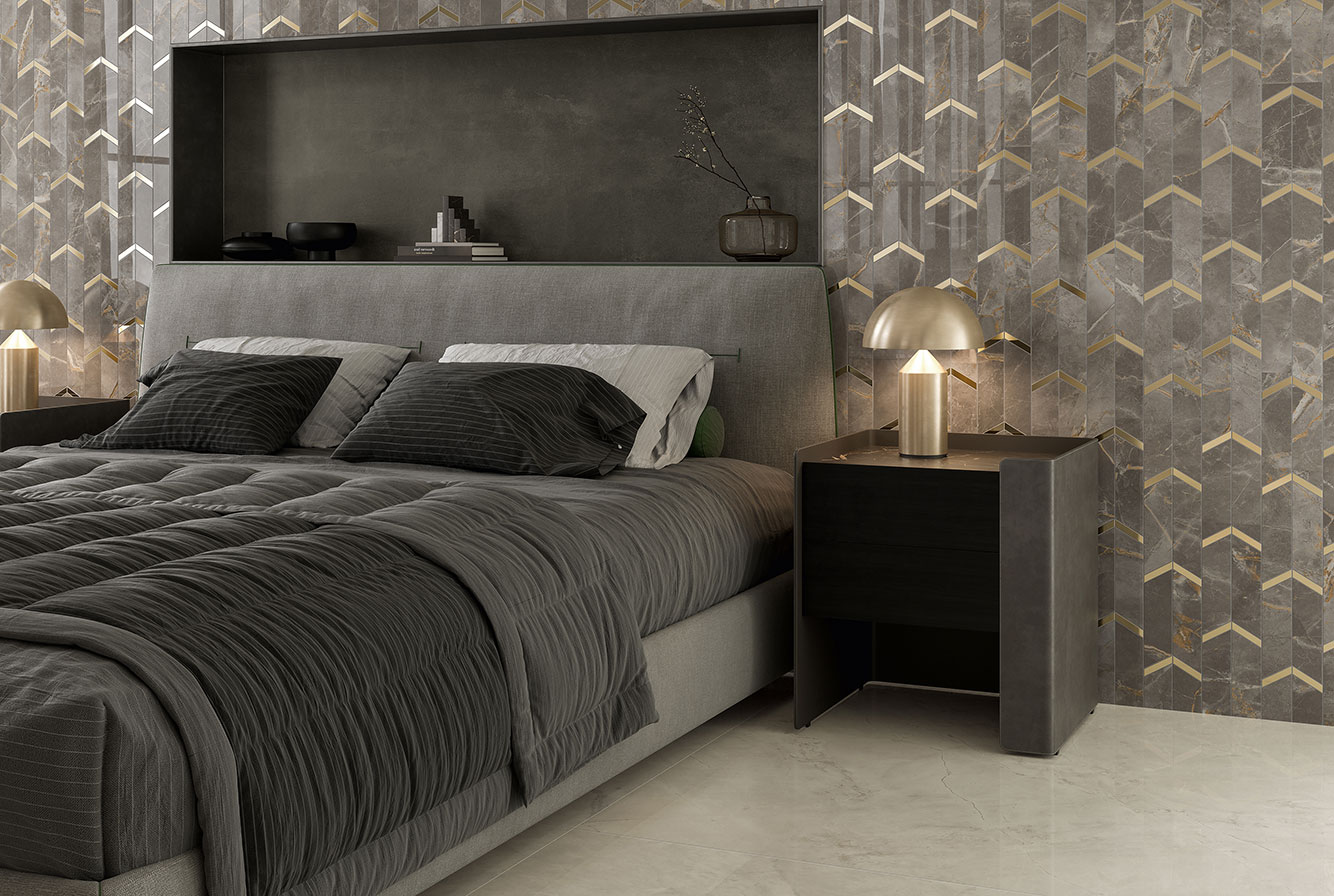 Fior di Bosco - имитирует тосканский мрамор, серого насыщенного цвета с четкими золотистыми прожилками, придающими материалу яркую индивидуальность. Лаппатированная поверхность раскрывает богатство и глубину деталей, матовая и Hammered подчеркивают натуральный вид камня.
