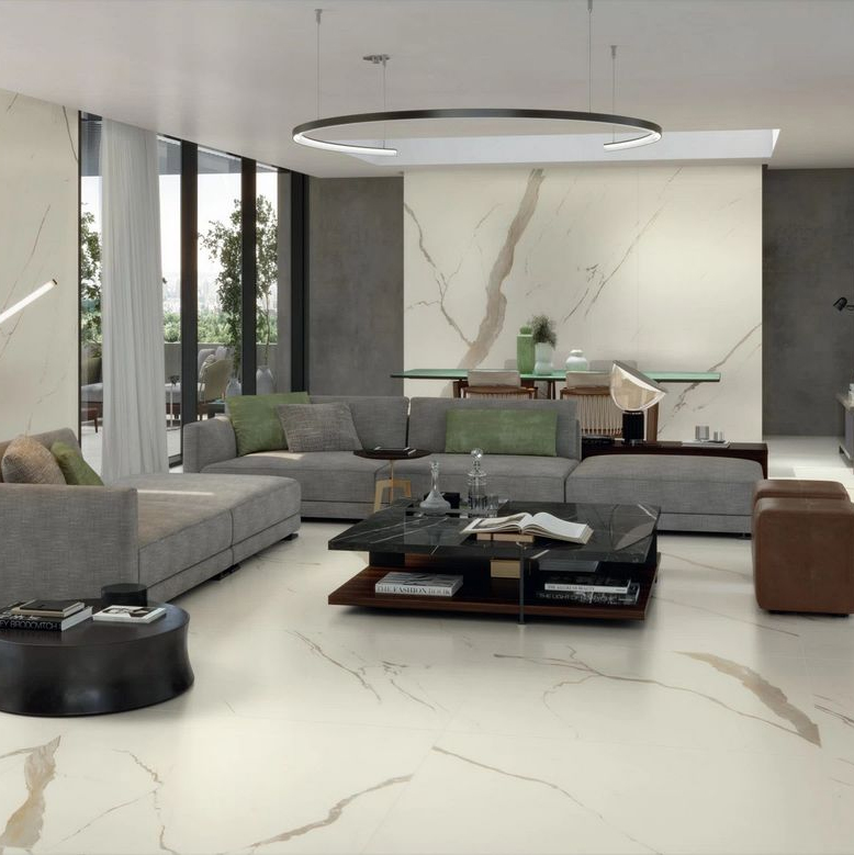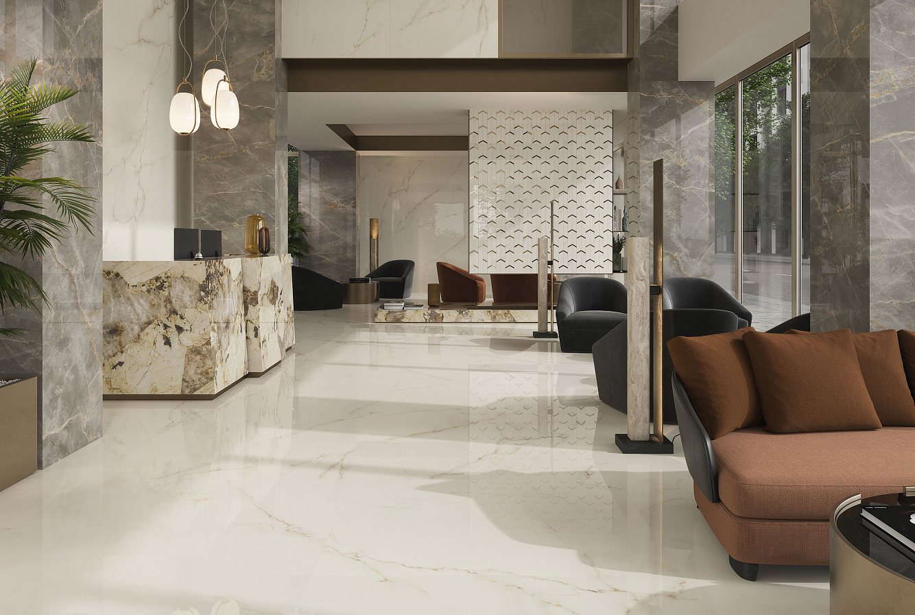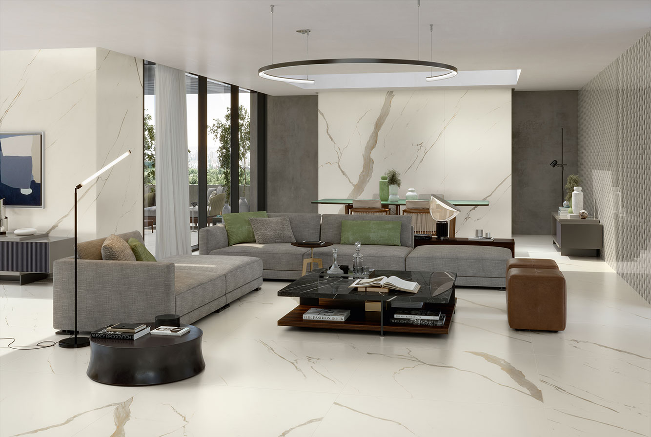 Calacatta Apuano - имитирует мрамор Calacatta Michelangelo, отличающийся теплым фоном с золотистыми прожилками, которые уходят вглубь в лаппатированном варианте и мягко сливаются между собой на поверхностях Matt и Silk.