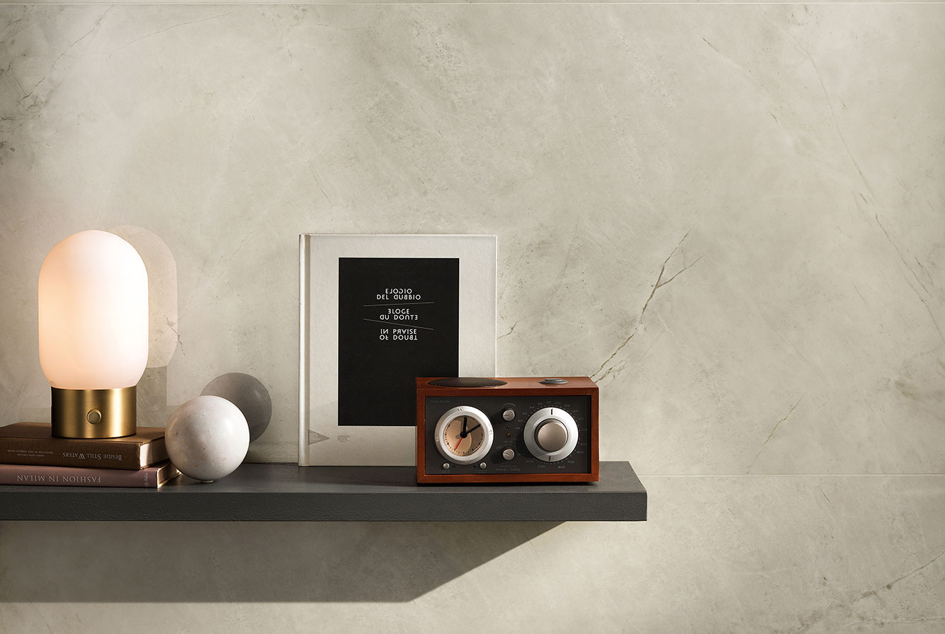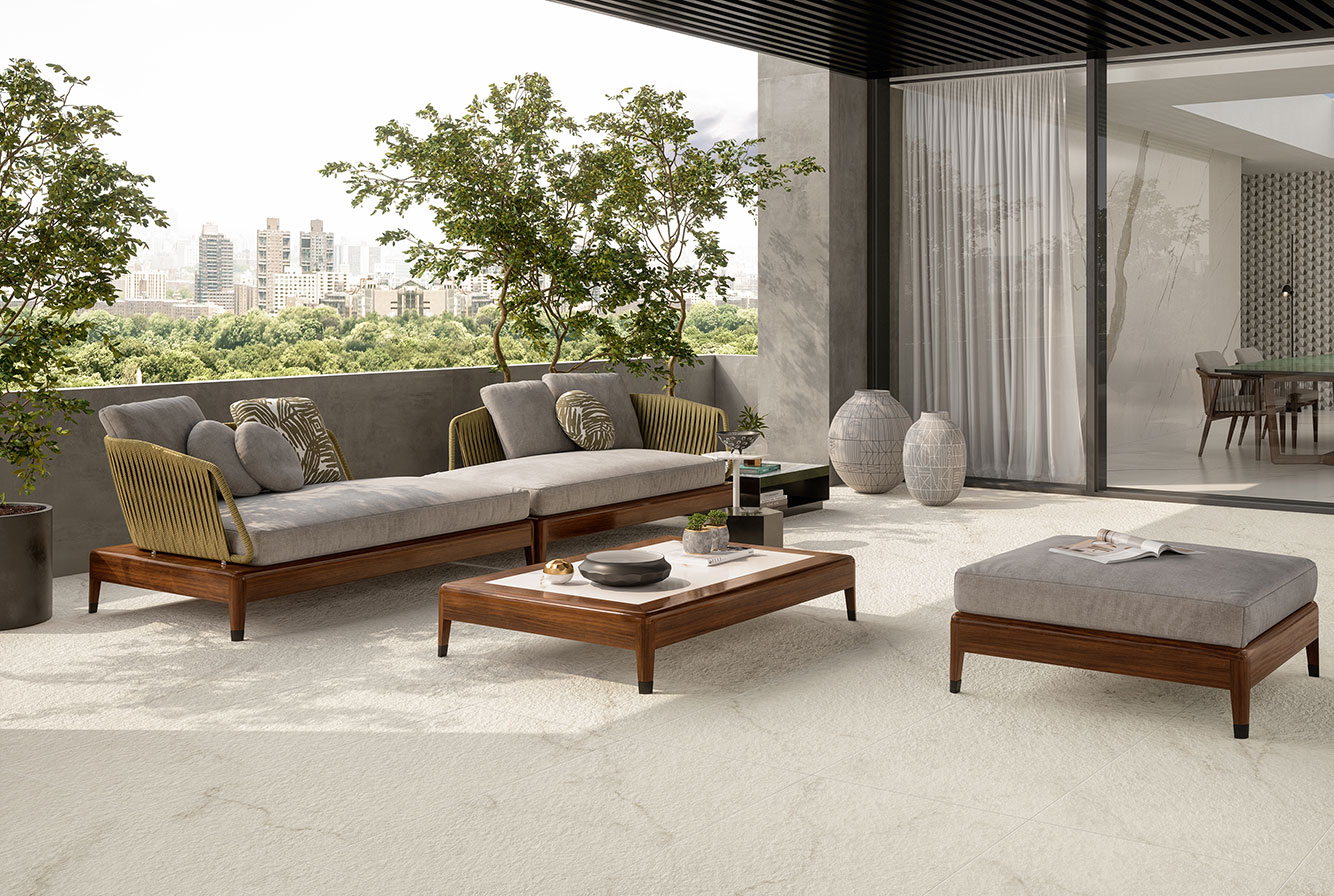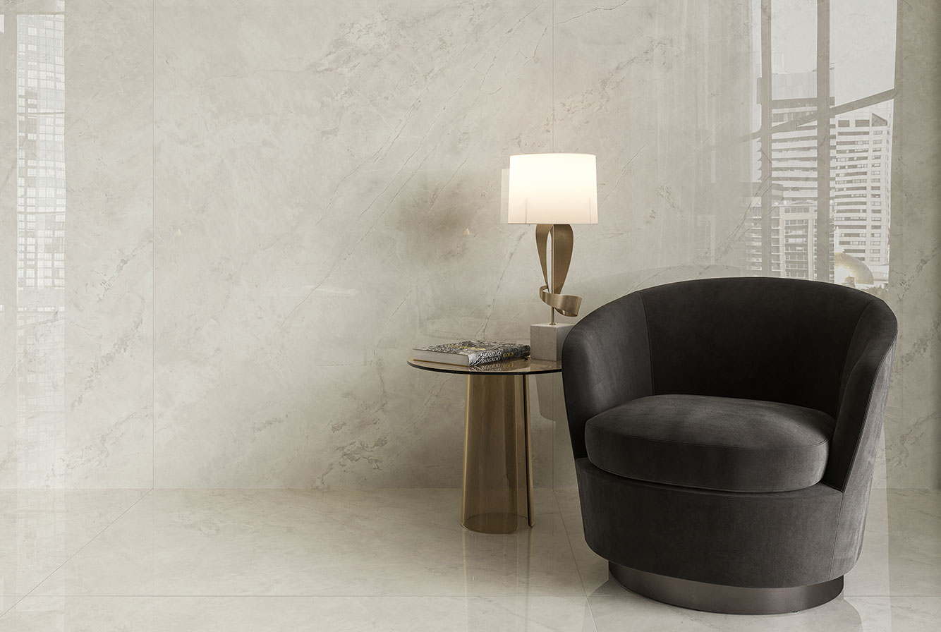 Calacatta Apuano - имитирует мрамор Calacatta Michelangelo, отличающийся теплым фоном с золотистыми прожилками, которые уходят вглубь в лаппатированном варианте и мягко сливаются между собой на поверхностях Matt и Silk.