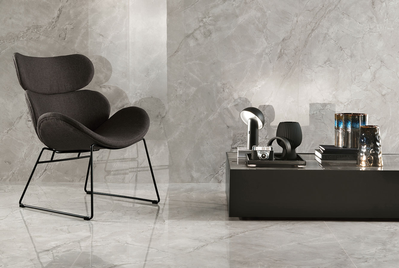 Calacatta Perla - имитация бразильского кварцита в жемчужно-серой гамме с тонкими серыми жилками и кристаллическими включениями.