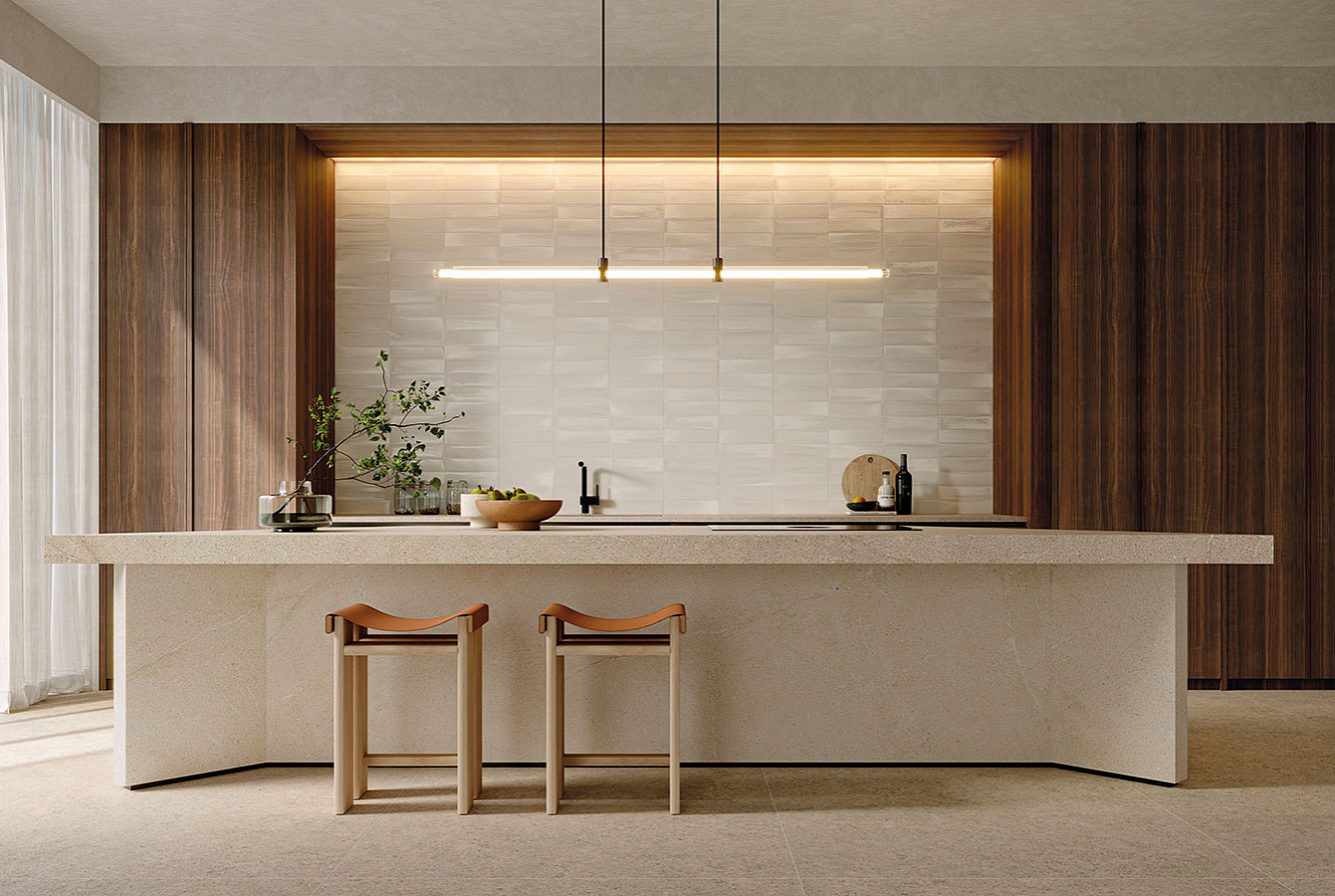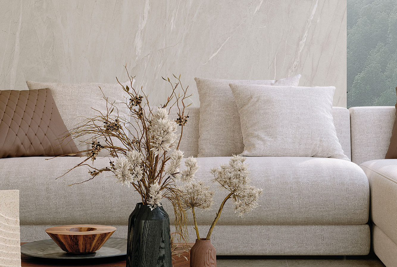 Трёхмерная отделка Cortex в цвете Siberian Ivory в формате 120x278 см имитирует эффект коры на каменной поверхности.