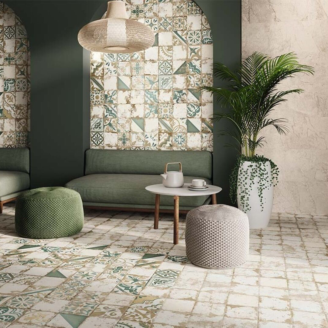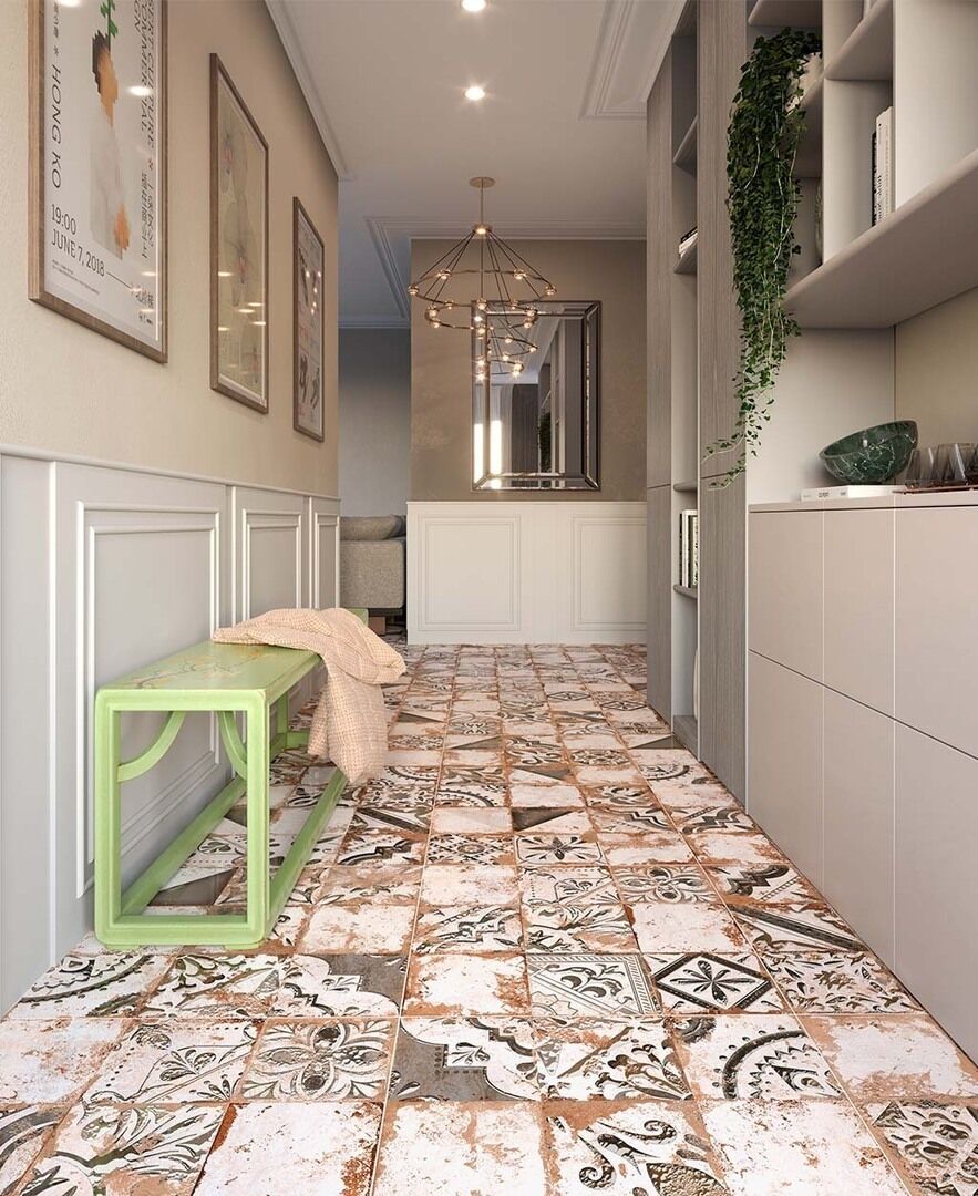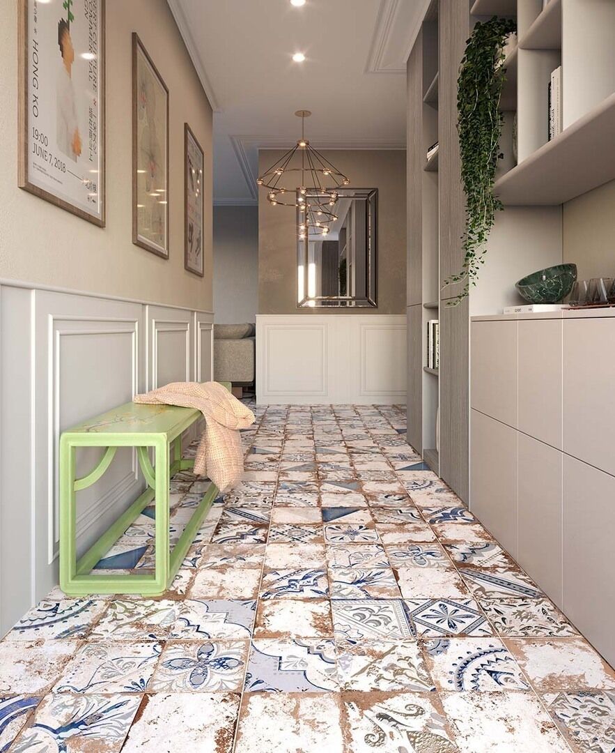 - Каждая плитка имеет уникальный рисунок — от абстрактных геометрических элементов до классических цветочных орнаментов.