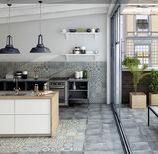 Керамогранит Gaya Fores Rustic выполнен под камень. Имитационный эффект усиливает матовая поверхность. Оттенки плитки универсальные: бежевые и серые. Оживить интерьер помогут декоры Rustic: Heritage Mix и Heritage Black. При единой пэчворк-стилистике, они отличаются оттенками. В первом случае наблюдаем сочетание монохромности и цвета. Во втором заметна неоспоримая монополия серых и белых тонов.