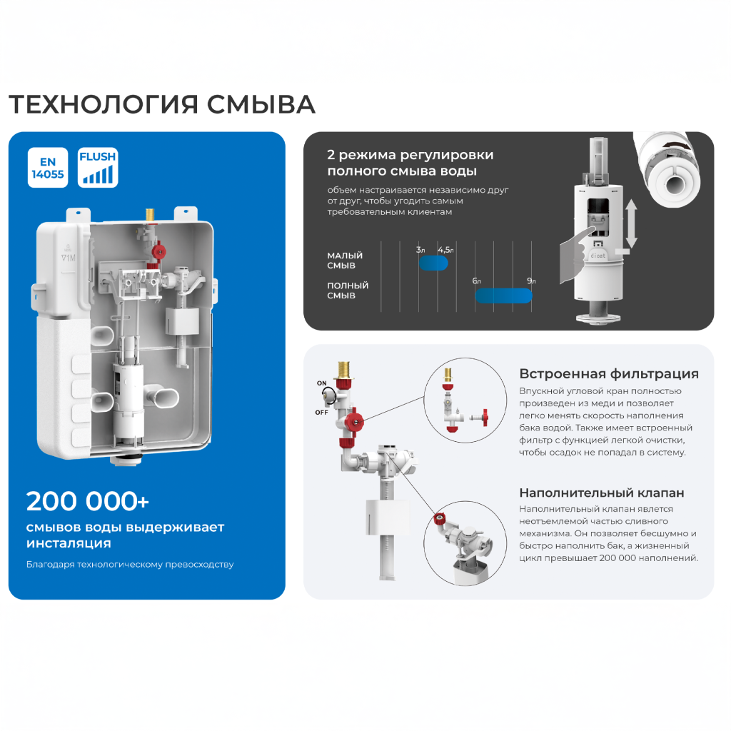 • независимая регулировка малого и полного смыва: малый смыв от 3 до 4,5 л, большой от 6 до 9 л, что делает ее эффективной и экономичной, позволяя настроить смыв в зависимости от ваших нужд