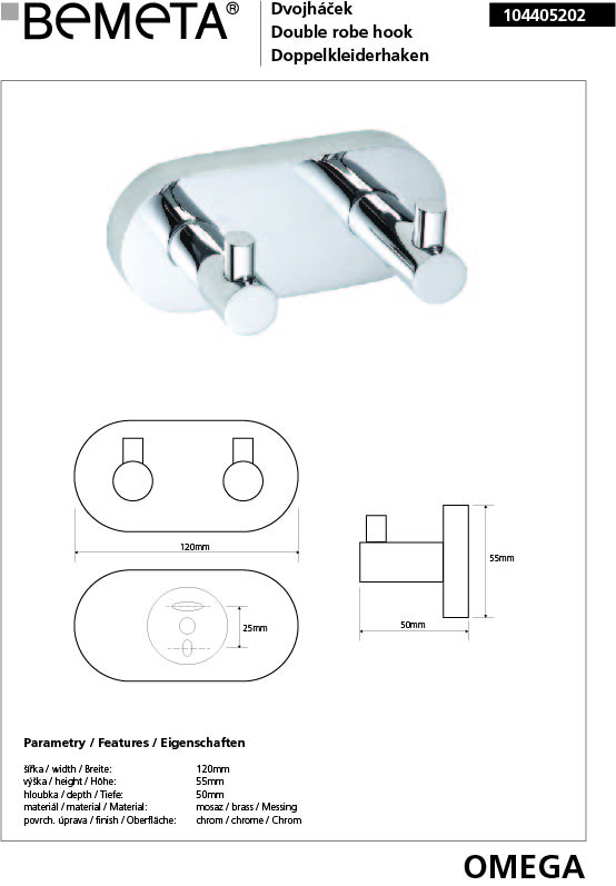 Планка с 2-мя крючками Bemeta Omega 104405202