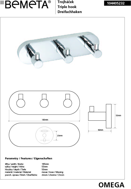 Планка с 3-мя крючками Bemeta Omega 104405232