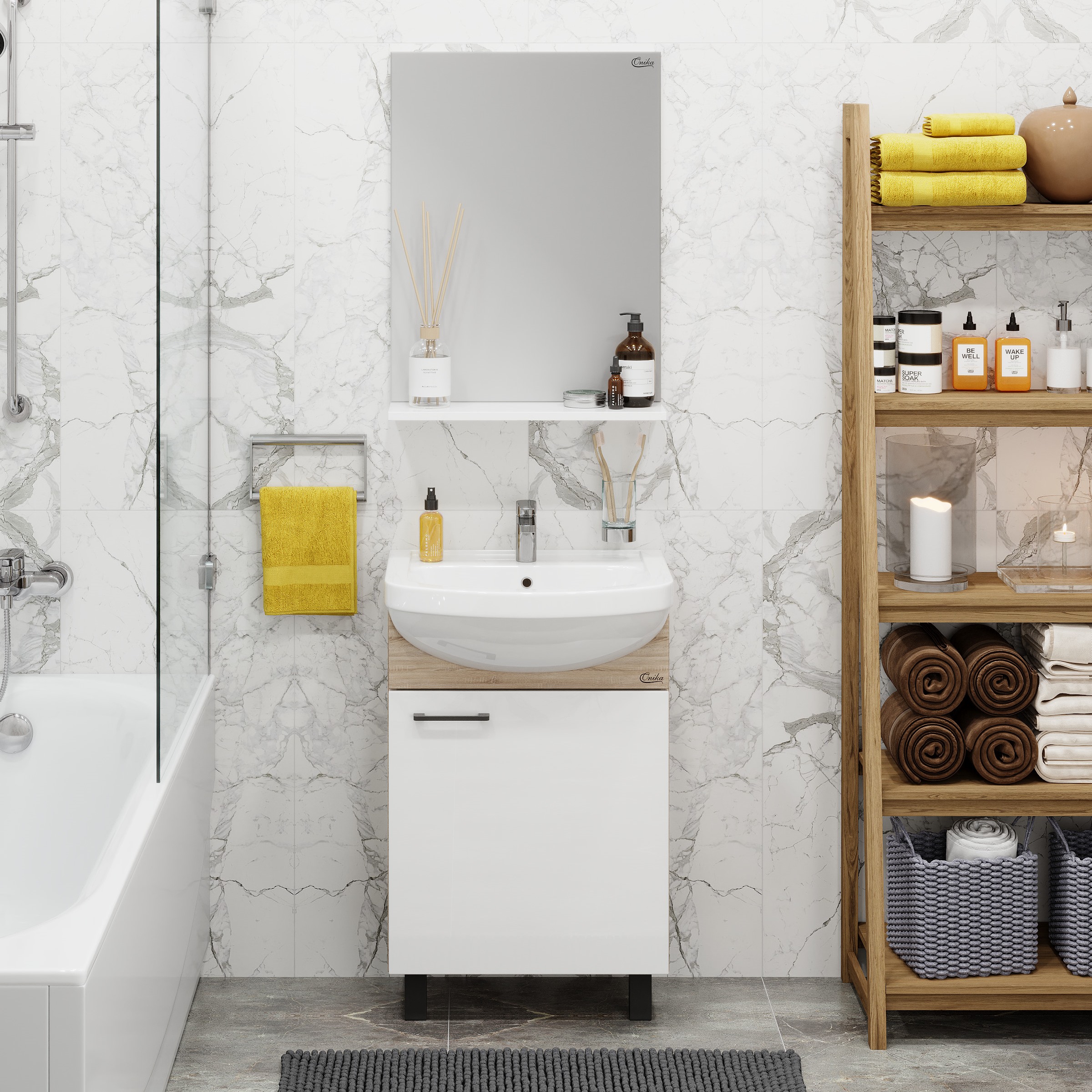 Напольная тума для ванной комнаты Onika Эко 52 Black - это идеальное сочетание минимализма, функциональности и цены. Компактные габариты позволяют грамотно организовать небольшой санузел, а белый фасад и корпус цвета дуба гармонично сочетаются с черной фурнитурой и отлично впишутся в интерьер любой ванной комнаты. Распашная дверца скрывает вместительное пространство для хранения, разделенное полкой. Тумба выполнена из ЛДСП, устойчивой к механическим воздействиям, перепадам температур и высокой влажности. Хромированная ручка и 4 ножки (2 декоративных и 2 пластиковых) с регулировкой по высоте идут в комплекте с тумбой.
