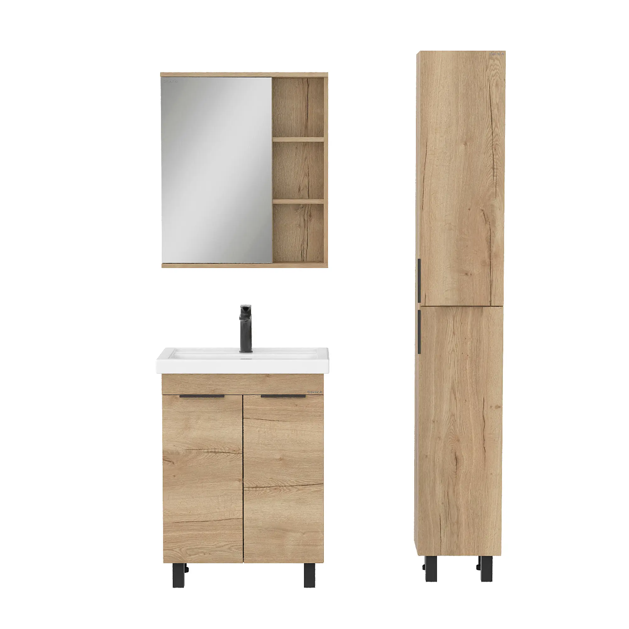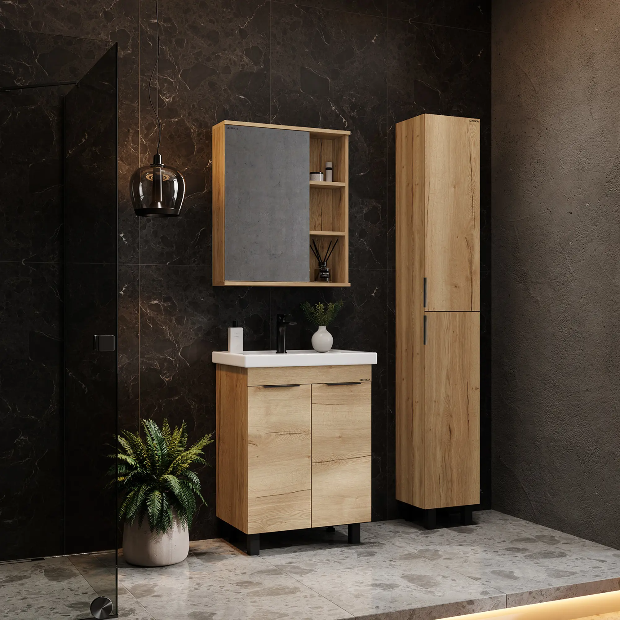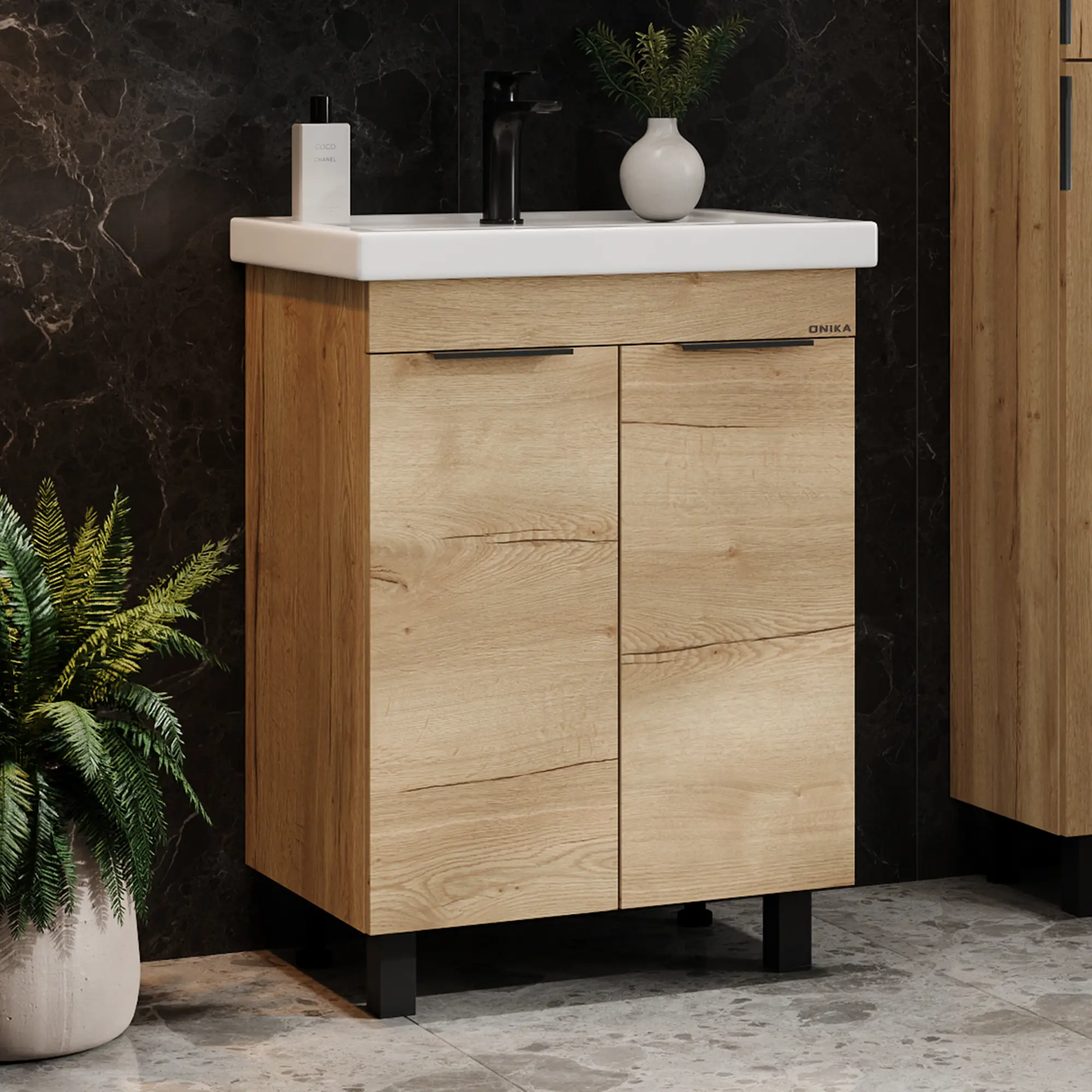 Напольная тумба под раковину для ванной комнаты Onika Легран 50 - это сочетание насыщенного древесного декора и благородства металла: роскошная текстура и натуральный цвет дуба дают теплоту, а черная матовая фурнитура добавляют урбанизма и солидности. За распашными дверцами с доводчиками расположено вместительное отделение, разделенное на две части горизонтальной полочкой, которое станет удобным местом для хранения различных бытовых принадлежностей. Тумба для ванной выполнена из ЛДСП, устойчивой к механическим воздействиям, перепадам температур и высокой влажности. 2 металлические ручки и 4 ножки (2 декоративных и 2 пластиковых) с регулировкой по высоте идут в комплекте с тумбой для ванны. Тумба для раковины Onika - это изысканность и утончённая роскошь в интерьере. Тумба под ванную станет удобным местом для хранения необходимых принадлежностей. Материал тумбы - ЛДСП - экологически чистый, обладающий высокой жесткостью и прочностью, что гарантирует долговечность вашей мебели. Преимущества тумба ванны: функциональность, простота монтажа, современный дизайн, высокое качество по доступной цене.