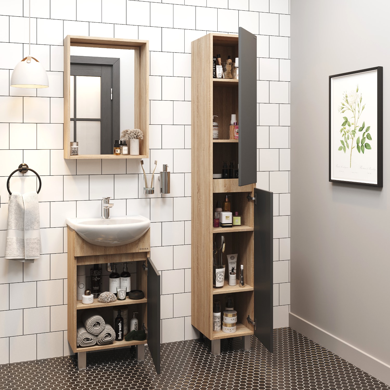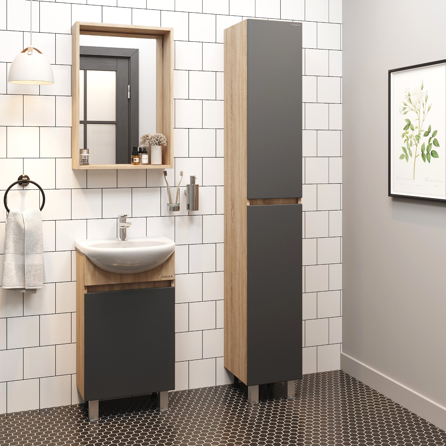 Напольная тумба для ванной комнаты Onika Милтон 45 - идеальное решение для небольшого санузла. Тумба сочетает в себе красоту и функциональность: серый матовый фасад с покрытием SoftTouch, корпус цвета дуб сонома с роскошной текстурой, строгие формы без декора. За дверцей с интегрированной ручкой скрывается пространство с полкой для размещения необходимых бытовых принадлежностей. Корпус тумбы выполнен из ЛДСП, фасад - из ЛМДФ в пленке, специально предназначенных для использования в условиях высокой влажности. 4 ножки (2 декоративных и 2 пластиковых) с регулировкой по высоте идут в комплекте с тумбой.