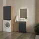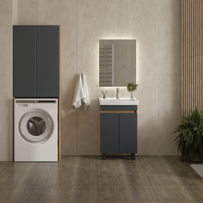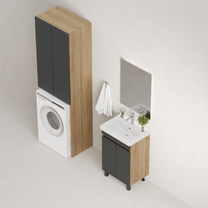 Тумба сочетает в себе красоту и функциональность: серый матовый фасад с покрытием SoftTouch, корпус цвета дуб сонома с роскошной текстурой, строгие формы без декора. За дверцей с интегрированной ручкой скрывается пространство с полкой для размещения необходимых бытовых принадлежностей. Корпус тумбы выполнен из ЛДСП, фасад — из ЛМДФ в пленке, специально предназначенных для использования в условиях высокой влажности. Ножки (2 декоративных и 2 пластиковых) идут в комплекте с тумбой.