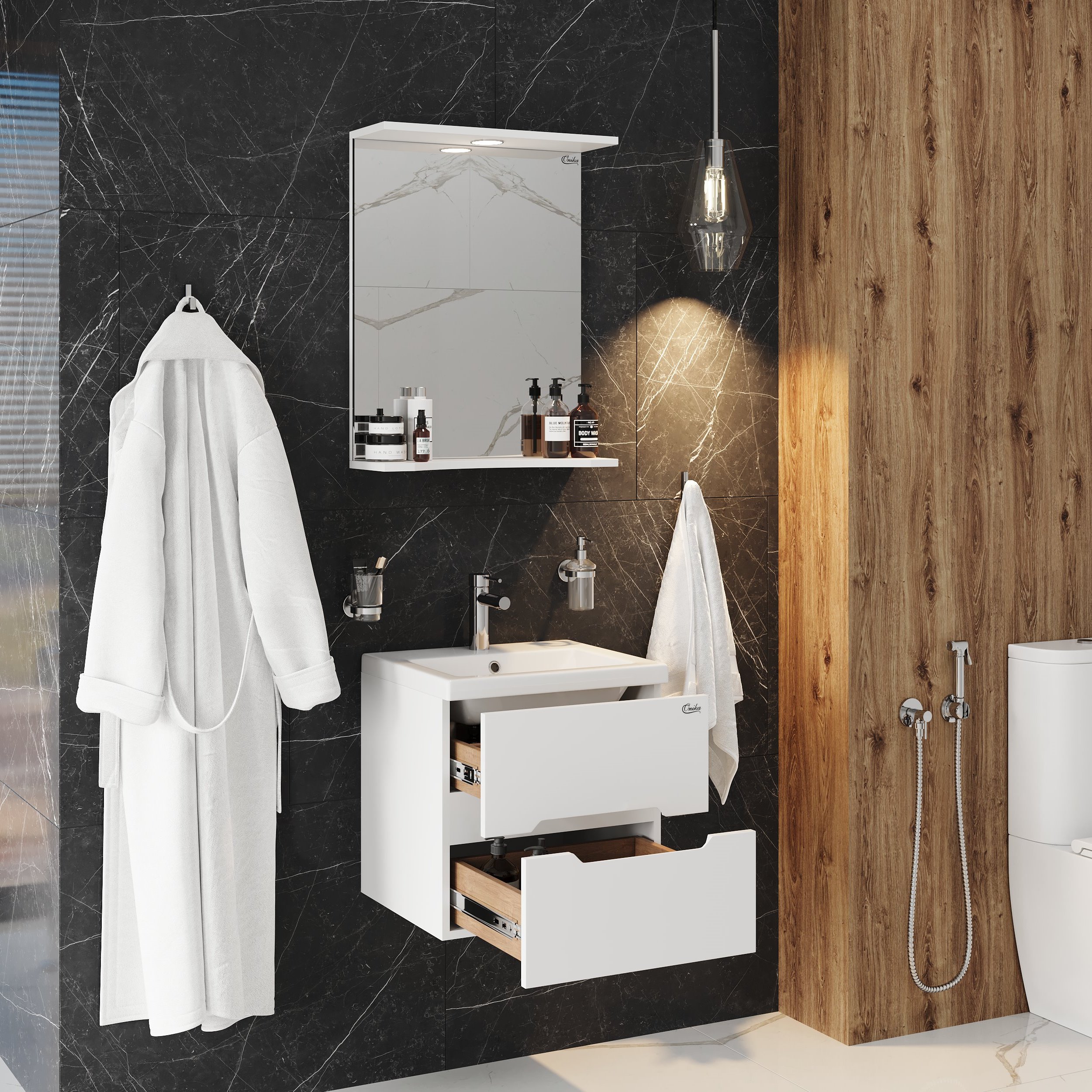 Подвесная тумба для ванной комнаты Onika Айленд 50 сочетает в себе стильный минималистичный дизайн, белую глянцевую поверхность и высочайшее качество исполнения. Тумба имеет два ящика с направляющими полного выдвижения: нижний предназначен для больших предметов, а верхний, имеющий удобную систему организации пространства, - для мелких аксессуаров. Ручки, изящно интегрированные в фасады, позволяют сделать эксплуатацию мебели более удобной и практичной. Корпус тумбы выполнен из ЛДСП, фасады ящиков - из ЛМДФ в пленке, устойчивых к механическим воздействиям, перепадам температур и высокой влажности. Тумба надежно крепится к стене и не занимает место на полу, не создавая при этом сложностей в уборке ванной комнаты. Подвесы для крепления тумбы - в комплекте.
