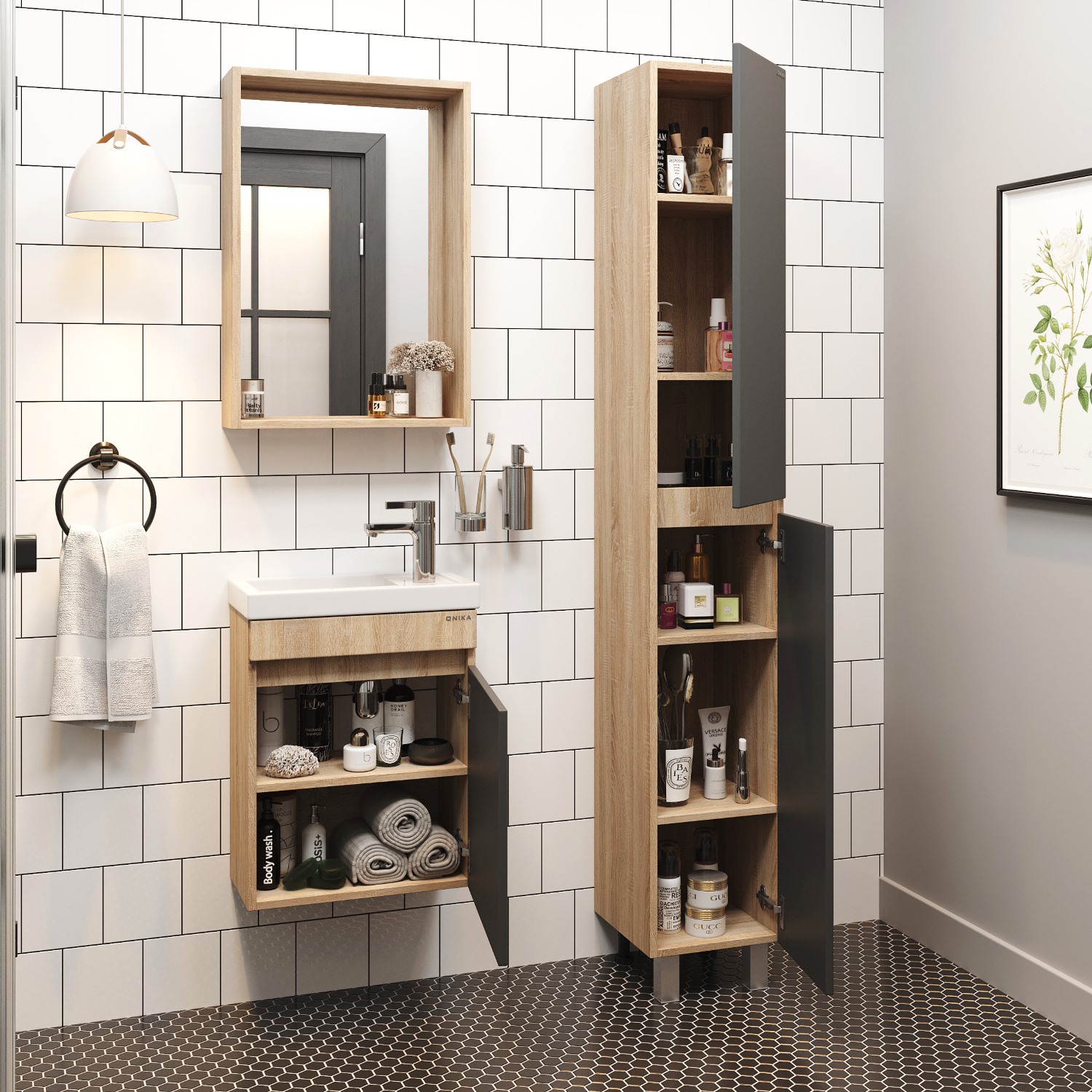 Подвесная тумба для ванной комнаты Onika Милтон 45 - идеальное решение для небольшого санузла. Тумба сочетает в себе красоту и функциональность: серый матовый фасад с покрытием SoftTouch, корпус цвета дуб сонома с роскошной текстурой, строгие формы без декора. За дверцей с интегрированной ручкой скрывается пространство с полкой для размещения необходимых бытовых принадлежностей. Корпус тумбы выполнен из ЛДСП, фасад - из ЛМДФ в пленке, специально предназначенных для использования в условиях высокой влажности. Тумба надежно крепится к стене и не занимает место на полу, не создавая при этом сложностей в уборке помещения. Подвесы для крепления тумбы - в комплекте.
