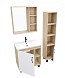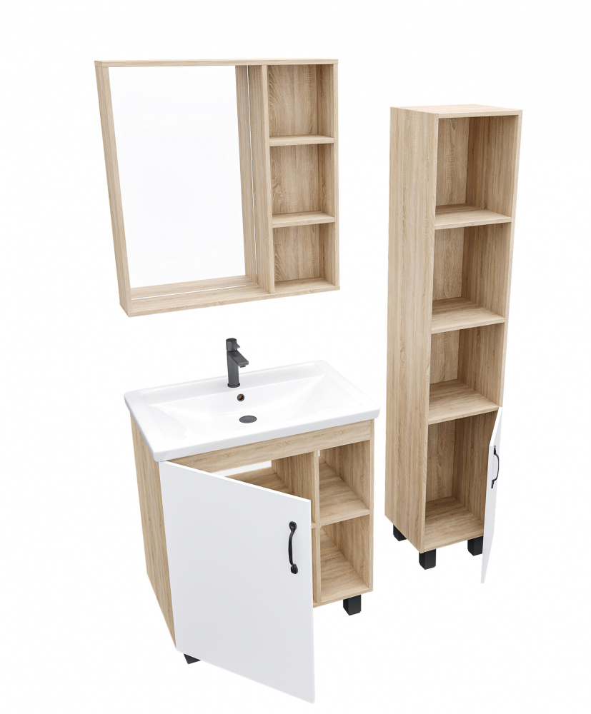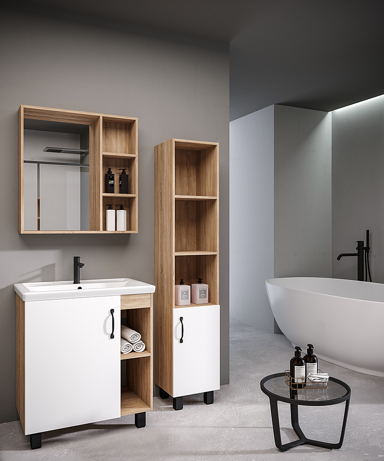 В тумбе Флай 70 сочетаются контрастные цвета и фактуры: белый матовый фасад с покрытием SoftTouch, корпус цвета дуба с текстурой, черная матовая фурнитура. Открытые полки справа обеспечивают быстрый доступ к аксессуарам, а пространство за распашной дверцей, снабженной системой плавного закрывания, станет удобным местом для хранения бытовых принадлежностей.