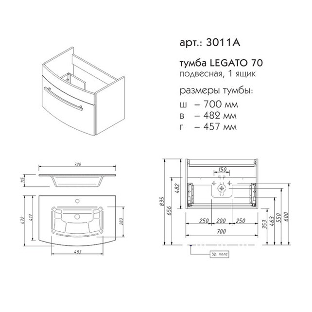 Тумба под раковину Caprigo Legato 70 см 1ящ 3011A цвета разные
