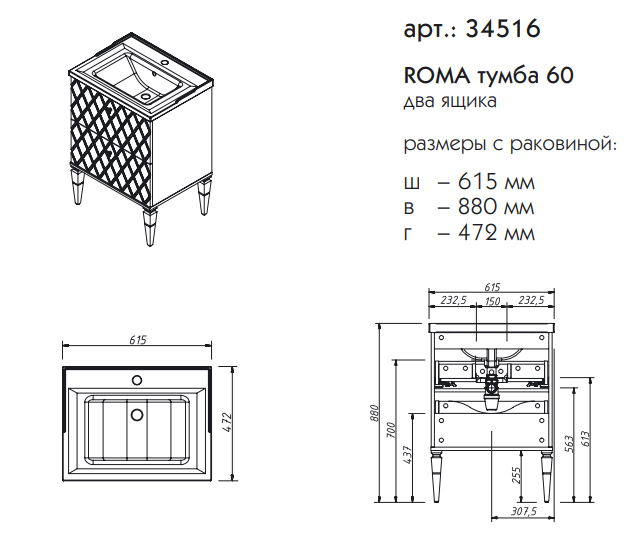Тумба под раковину Caprigo Roma 60 см ящики 34516 цвета разные