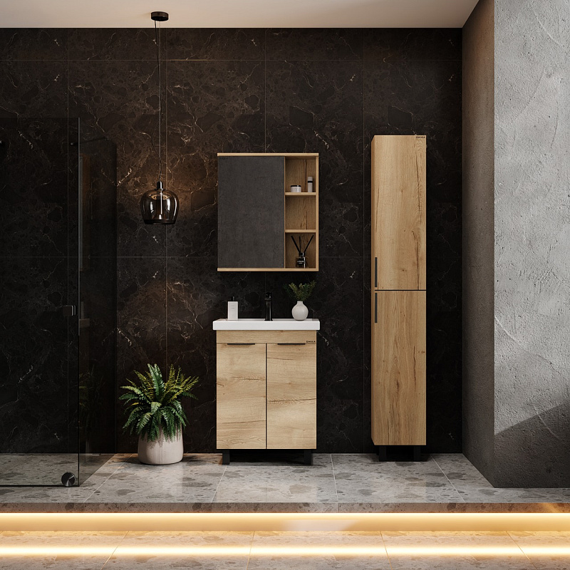 Напольная тумба под раковину для ванной комнаты Onika Легран 70 - это сочетание насыщенного древесного декора и благородства металла: роскошная текстура и натуральный цвет дуба дают теплоту, а черная матовая фурнитура добавляют урбанизма и солидности. За распашными дверцами с доводчиками расположено вместительное отделение, разделенное на две части горизонтальной полочкой, которое станет удобным местом для хранения различных бытовых принадлежностей. Тумба для ванной выполнена из ЛДСП, устойчивой к механическим воздействиям, перепадам температур и высокой влажности. 2 металлические ручки и 4 ножки (2 декоративных и 2 пластиковых) с регулировкой по высоте идут в комплекте с тумбой для ванны. Размеры тумбы в ванную без учета раковины и ножек 66x44x68 см. Гарантия на изделие 2 года. Совместимая раковина - Kirovit Фостер 70. Тумба для раковины Onika - это изысканность и утончённая роскошь в интерьере. Тумба под ванную станет удобным местом для хранения необходимых принадлежностей. Материал тумбы в ванну - ЛДСП - экологически чистый, обладающий высокой жесткостью и прочностью, что гарантирует долговечность вашей мебели.