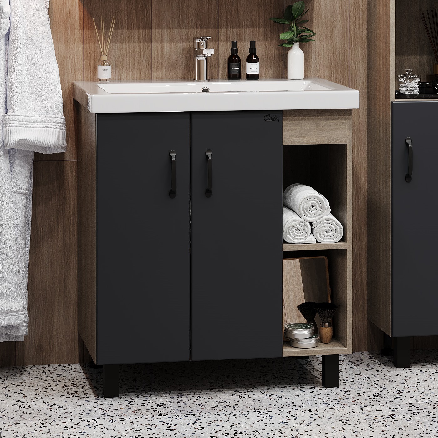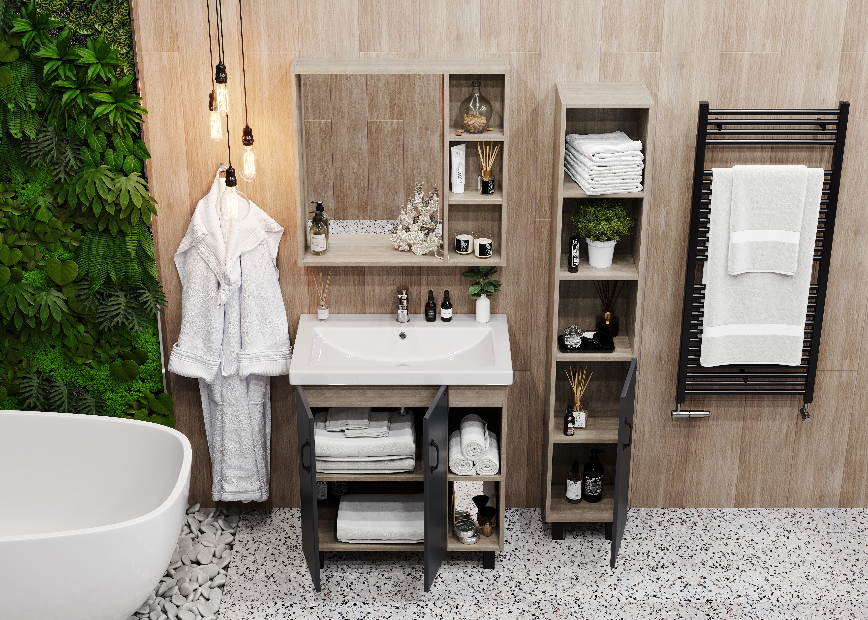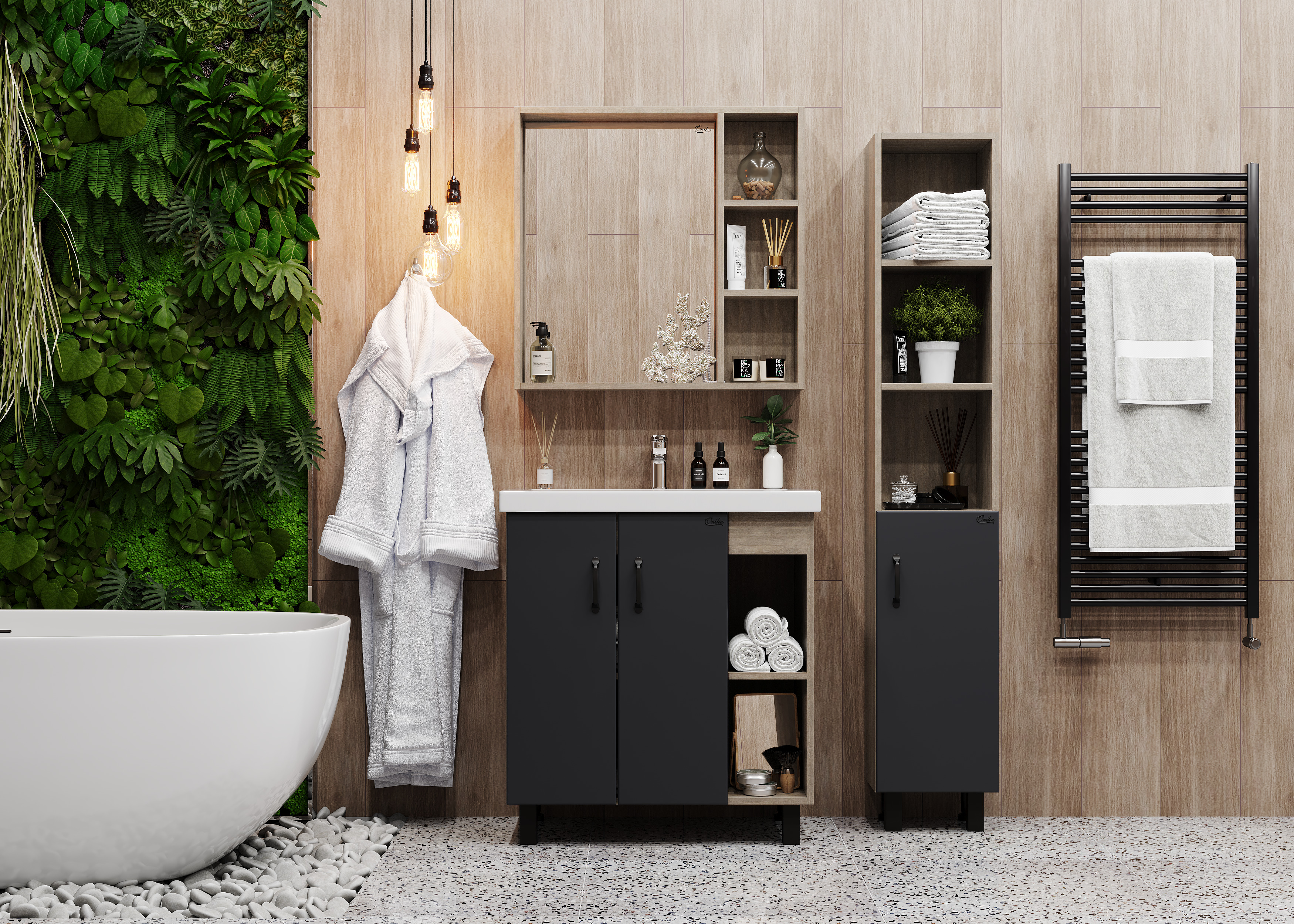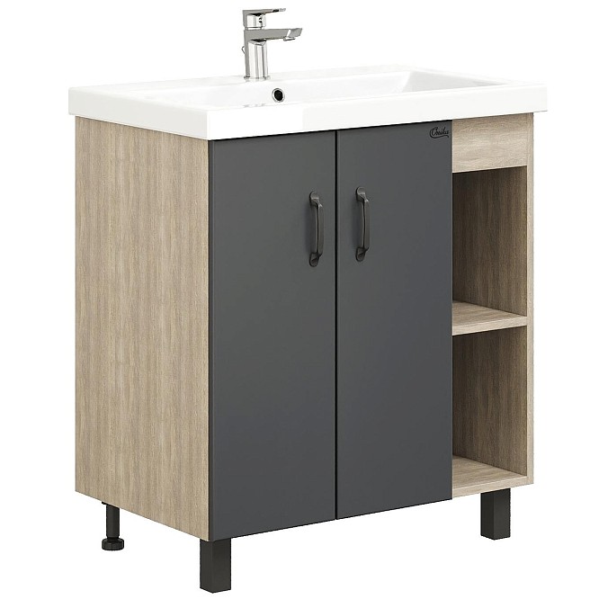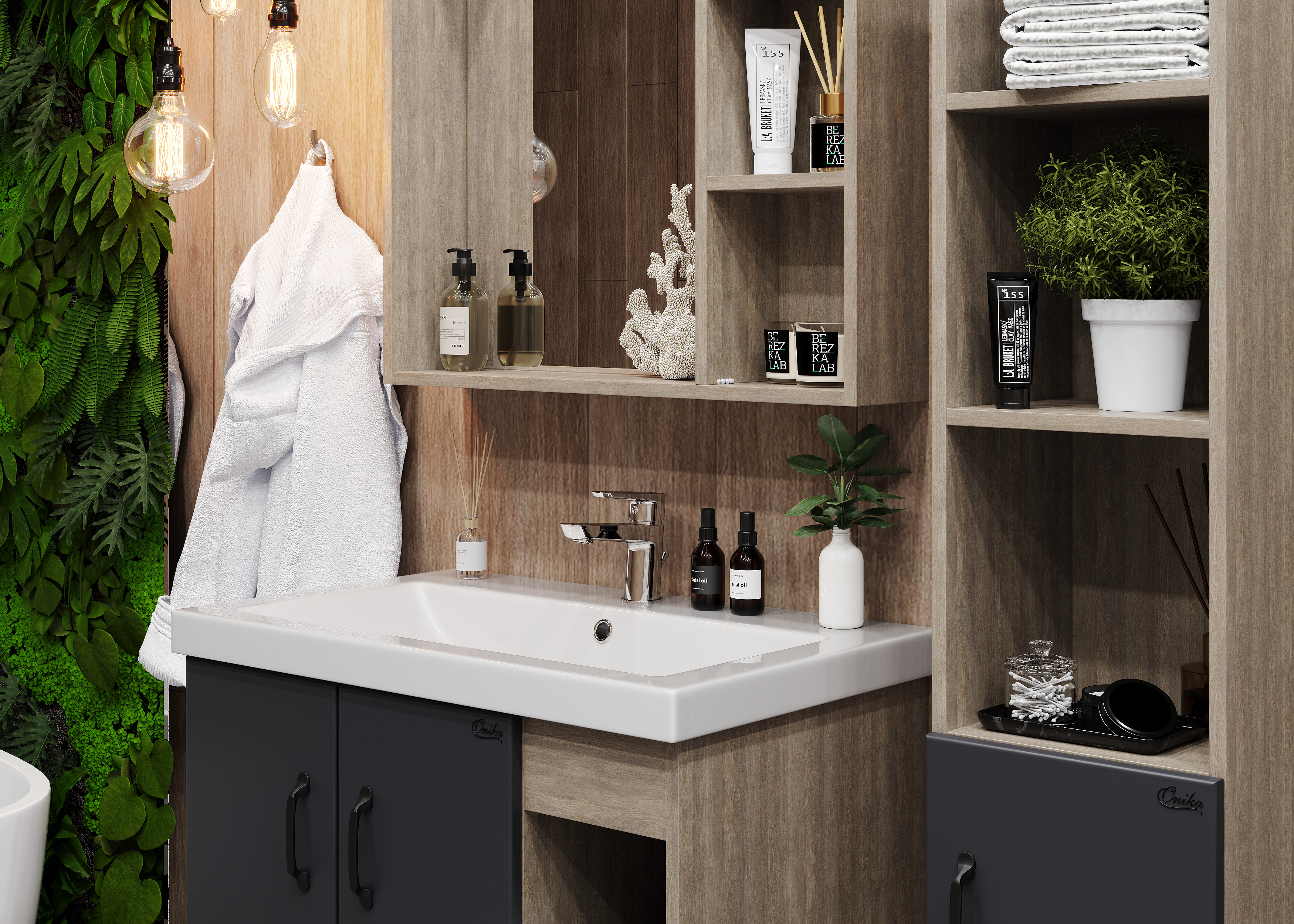 В тумбе Onika Тимбер 70 удачно сочетаются контрастные цвета и фактуры: серый матовый фасад с покрытием SoftTouch, корпус цвета дуба с роскошной текстурой, черная матовая металлическая фурнитура. Открытые полки справа обеспечивают быстрый доступ к часто используемым аксессуарам, а пространство за распашными дверцами слева, снабженными системой плавного закрывания, станет удобным местом для хранения различных бытовых принадлежностей. Корпус тумбы выполнен из ЛДСП, фасад - из ЛМДФ в пленке, устойчивых к механическим воздействиям, перепадам температур и высокой влажности. 2 черных металлических ручки и 4 ножки (2 декоративных черных и 2 пластиковых) идут в комплекте с тумбой.