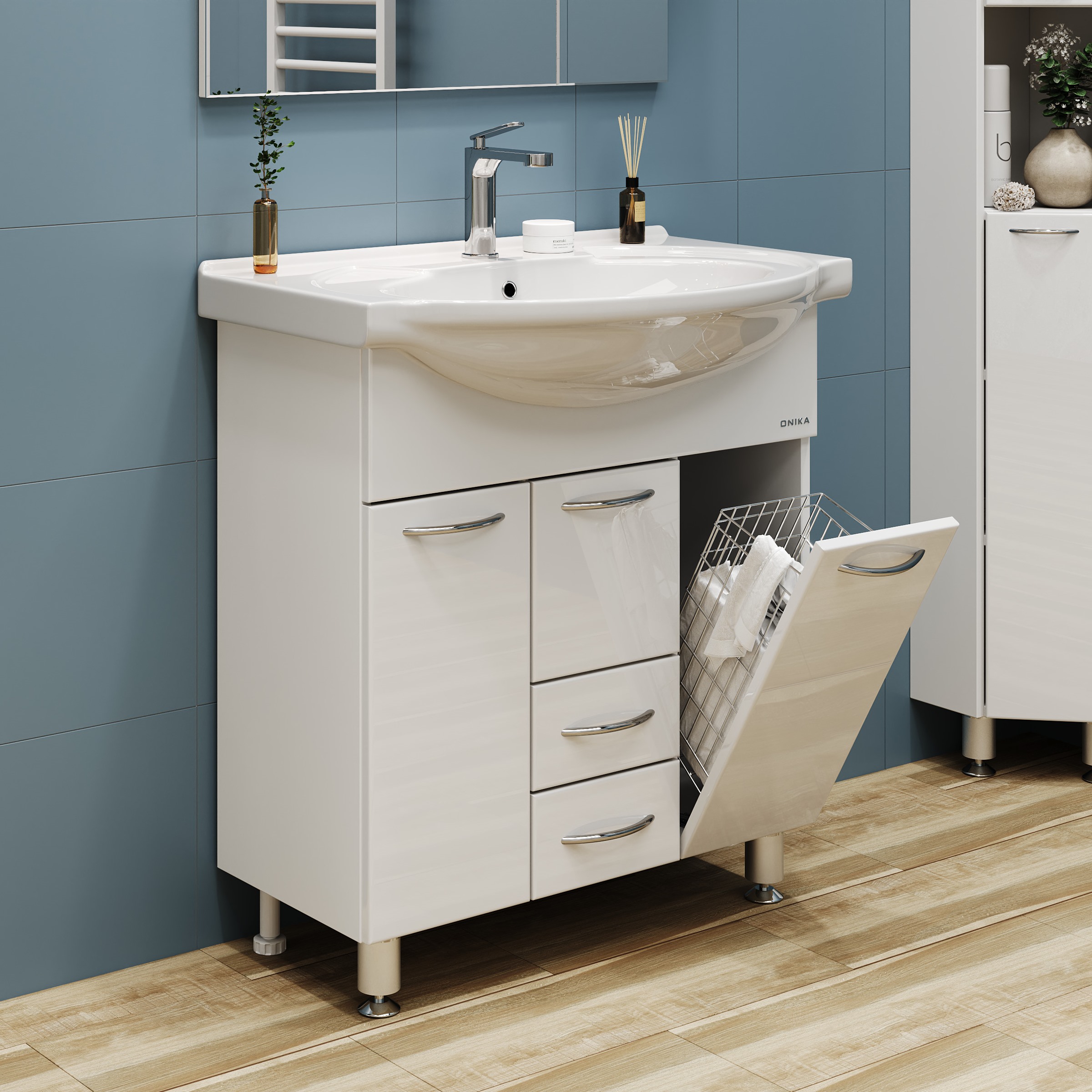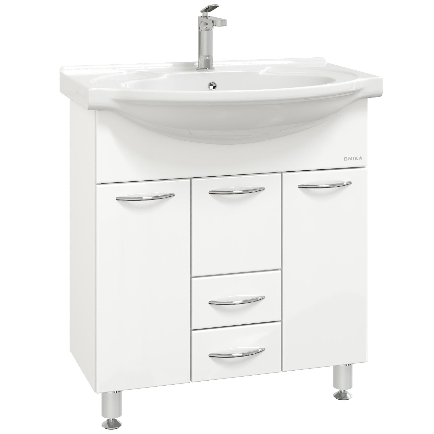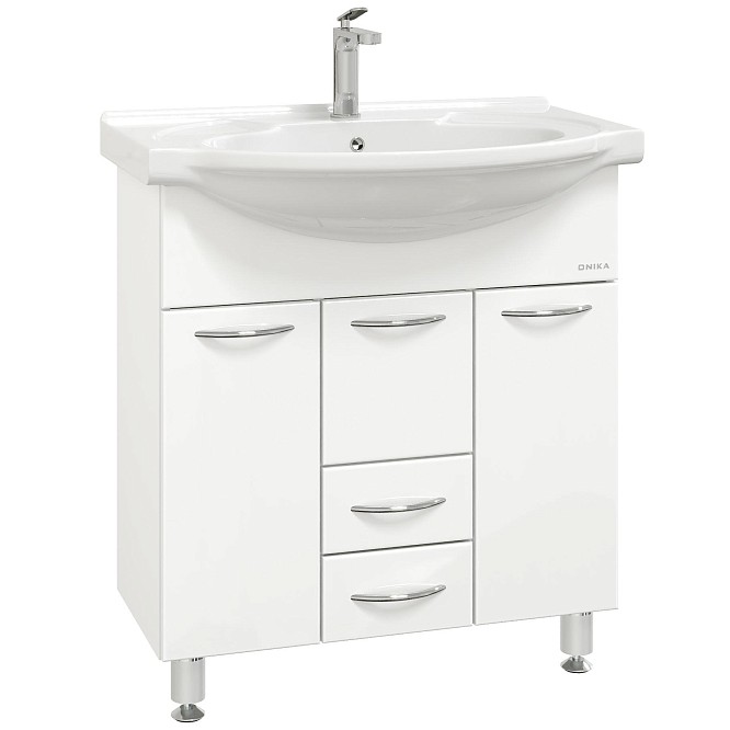Onika Моника 75 - простая напольная тумба для ванной комнаты с обширным функционалом. Белая глянцевая поверхность, простые узкие ручки, отсутствие декора, лаконичная форма и минималистичный дизайн подойдет к любому интерьеру. Внутреннее пространство тумбы позволяет компактно разместить бытовые принадлежности: большой отсек за распашной дверцей слева, откидная дверца с бельевой корзиной справа, два выдвижных ящика посередине. Маленькая откидная дверца по центру тумбы обеспечивает доступ к коммуникациям. Ящики тумбы оснащены направляющими полного выдвижения, а дверцы снабжены системой плавного закрывания. Корпус тумбы выполнен из ЛДСП, фасад - из ЛМДФ в пленке, устойчивых к механическим воздействиям, перепадам температур и высокой влажности. Пять хромированных ручек и четыре ножки (2 декоративных хромированных и 2 пластиковых) идут в комплекте с тумбой.