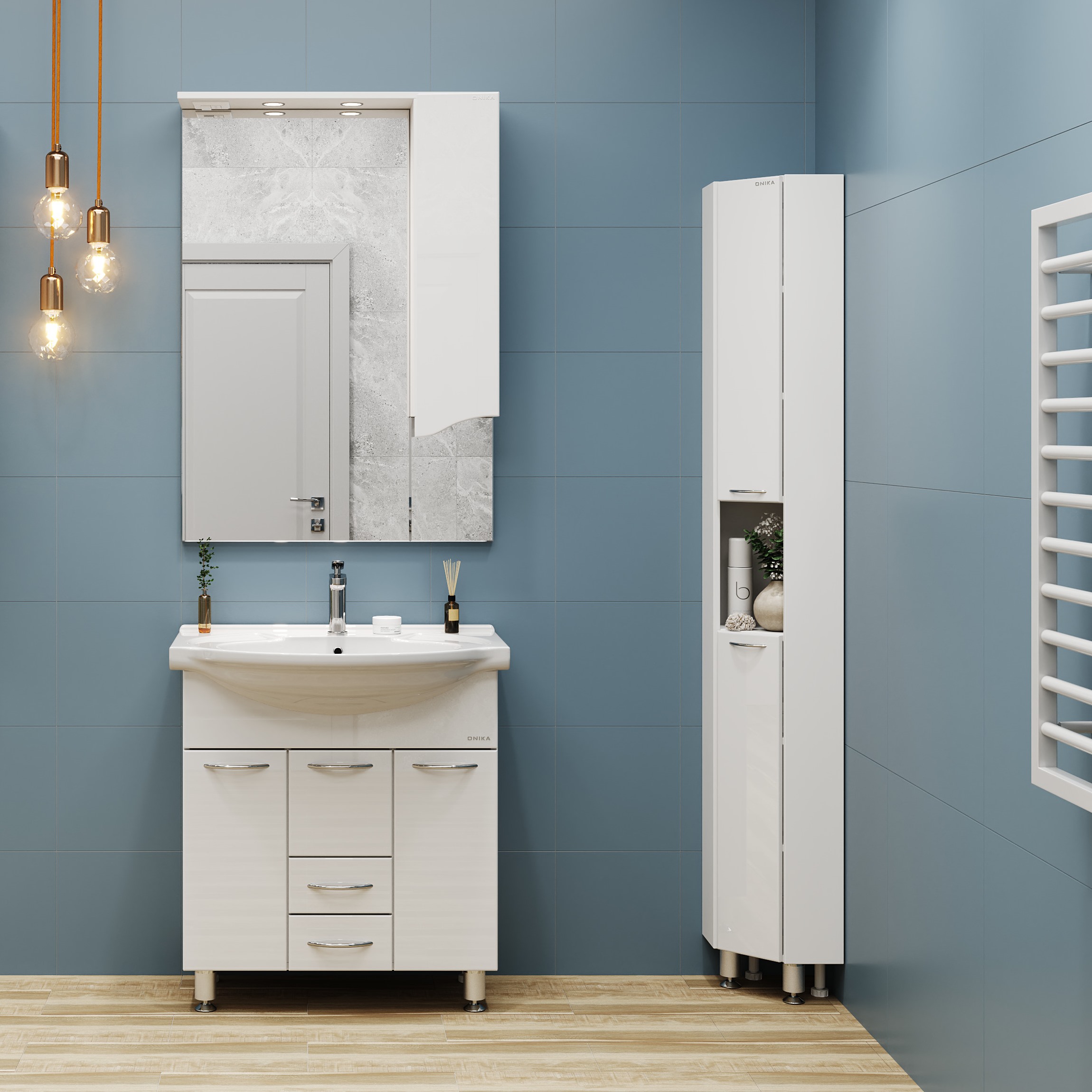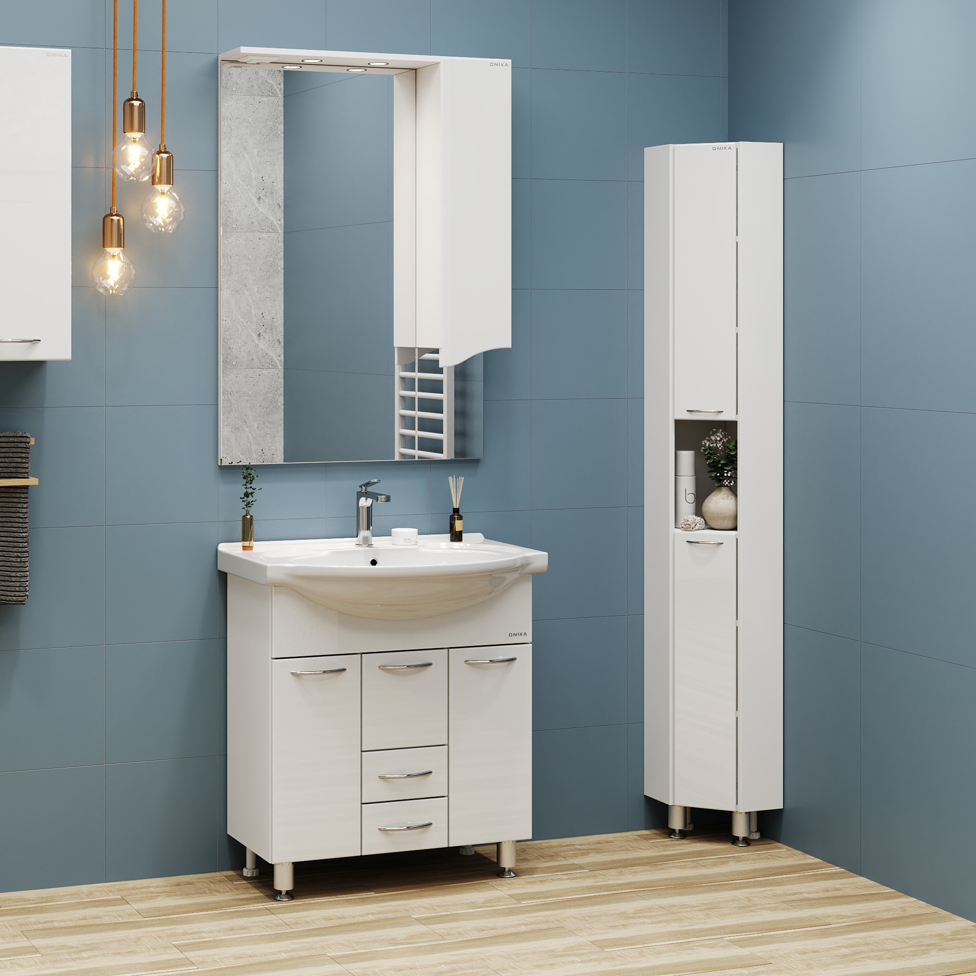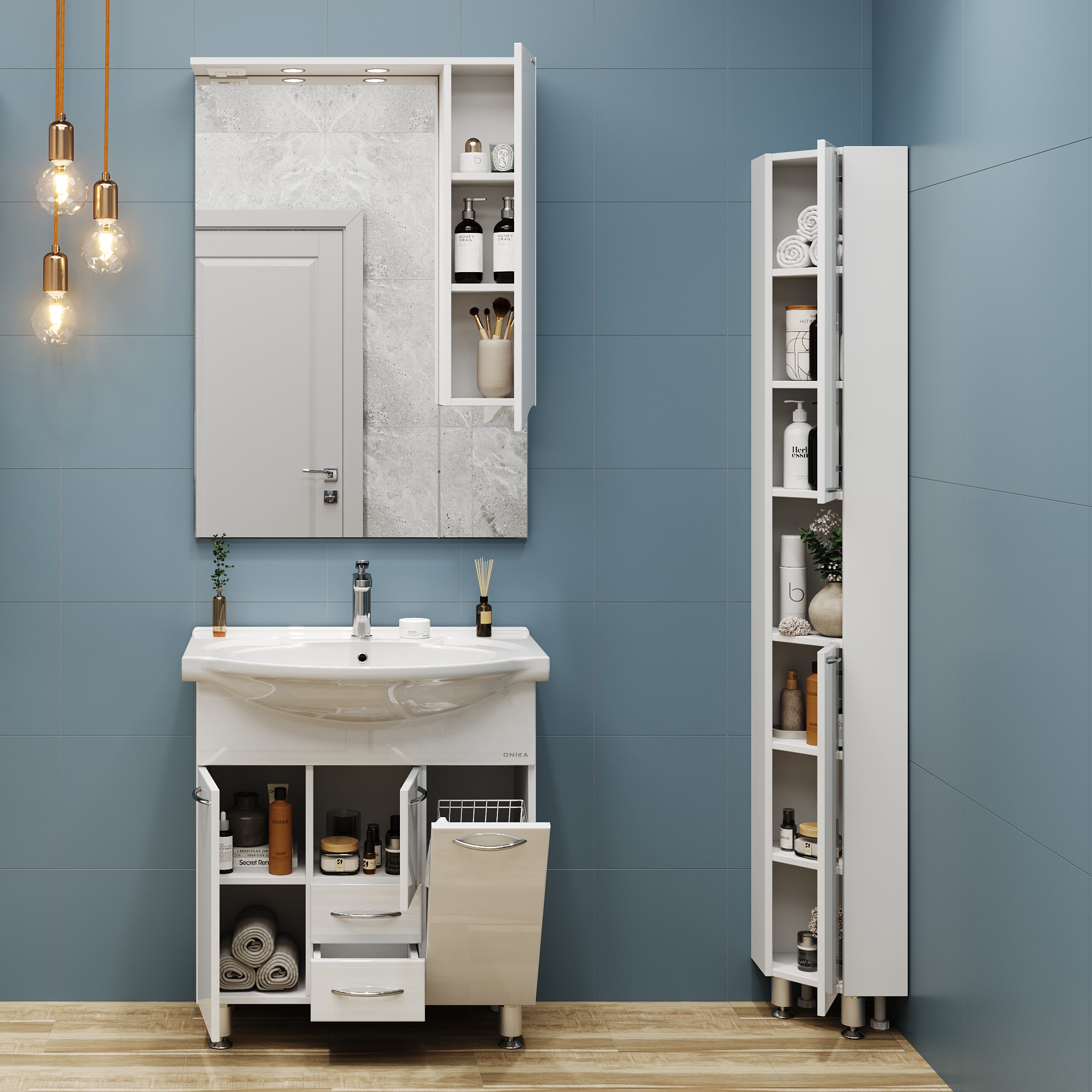Onika Моника 75 - простая напольная тумба для ванной комнаты с обширным функционалом. Белая глянцевая поверхность, простые узкие ручки, отсутствие декора, лаконичная форма и минималистичный дизайн подойдет к любому интерьеру. Внутреннее пространство тумбы позволяет компактно разместить бытовые принадлежности: большой отсек за распашной дверцей слева, откидная дверца с бельевой корзиной справа, два выдвижных ящика посередине. Маленькая откидная дверца по центру тумбы обеспечивает доступ к коммуникациям. Ящики тумбы оснащены направляющими полного выдвижения, а дверцы снабжены системой плавного закрывания. Корпус тумбы выполнен из ЛДСП, фасад - из ЛМДФ в пленке, устойчивых к механическим воздействиям, перепадам температур и высокой влажности. Пять хромированных ручек и четыре ножки (2 декоративных хромированных и 2 пластиковых) идут в комплекте с тумбой.