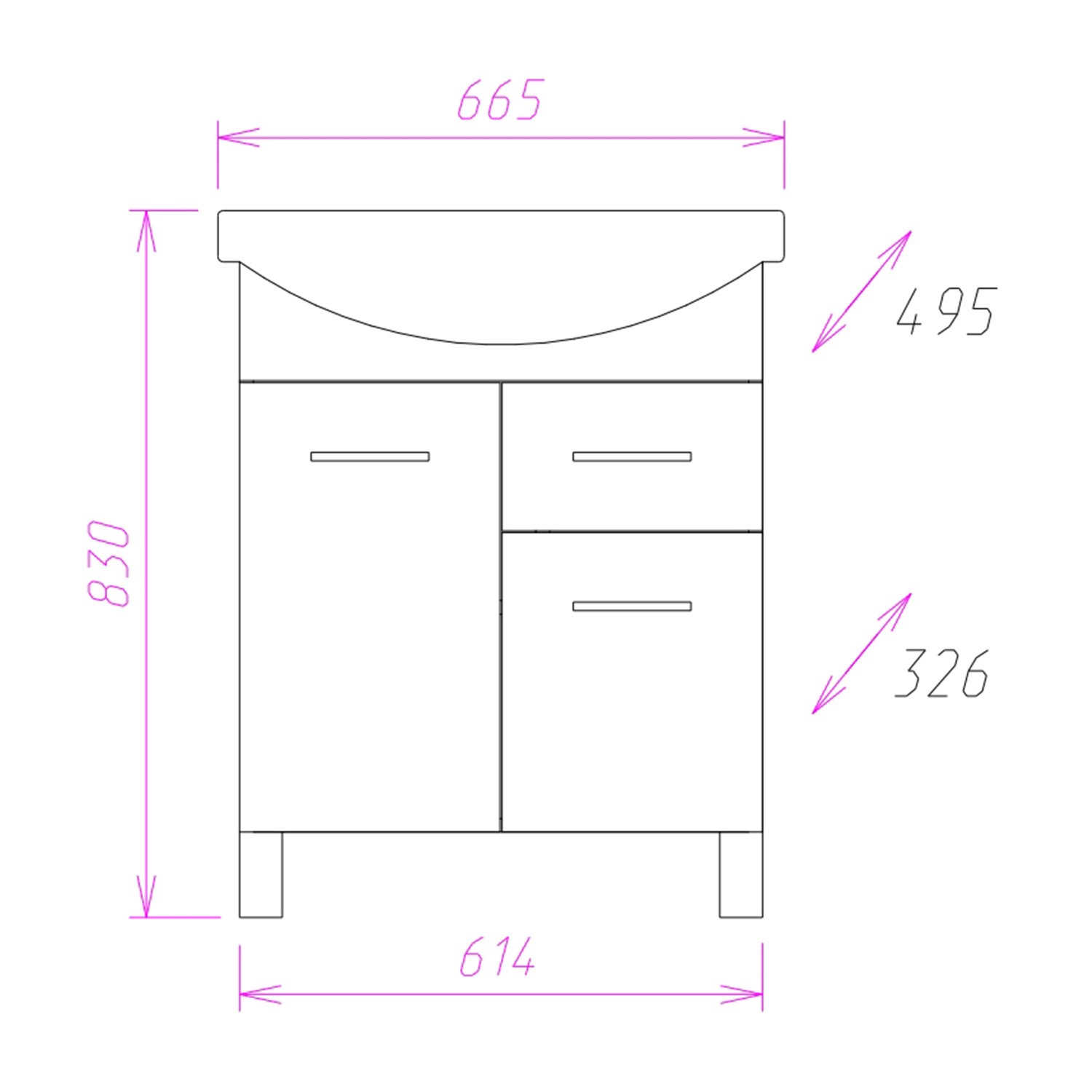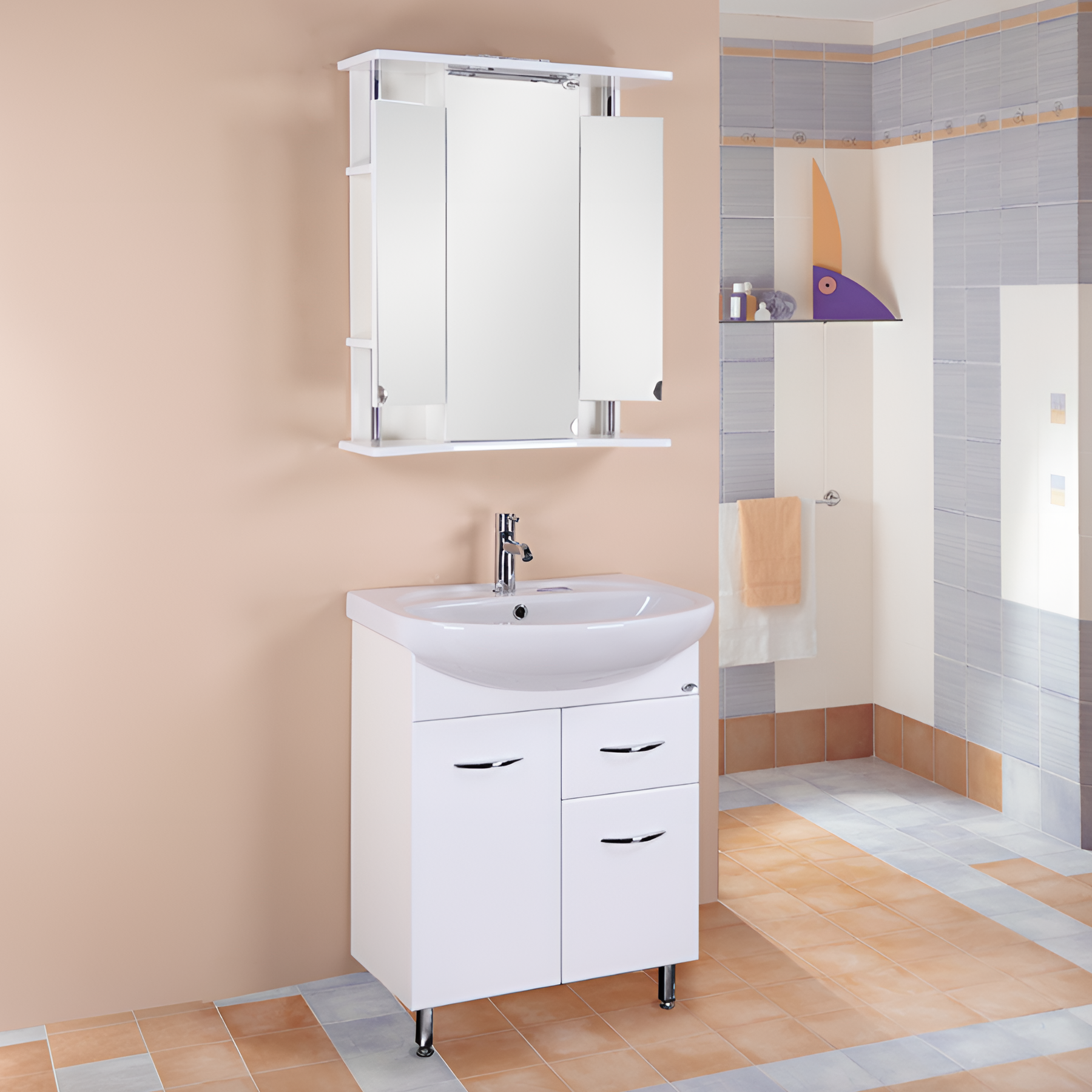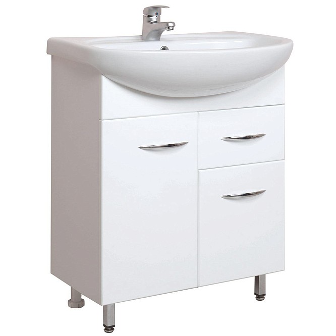 Тумба Onika Стелла 65 - достойный пример удобной мебели для небольшой ванной комнаты. Белая глянцевая поверхность, простые узкие ручки, отсутствие декора, лаконичная форма и минималистичный дизайн подойдет к любому интерьеру. В фасаде тумбы присутствует легкая асимметрия: слева расположена большая распашная дверца, за которой скрывается полка, а справа - выдвижной ящик, под ним - небольшая распашная дверца. Ящик тумбы оснащен направляющими полного выдвижения, а дверцы снабжены системой плавного закрывания. Корпус тумбы выполнен из ЛДСП, фасад - из ЛМДФ в пленке, устойчивых к механическим воздействиям, перепадам температур и высокой влажности. Три хромированных ручки и четыре ножки (2 декоративных хромированных и 2 пластиковых) идут в комплекте с тумбой.