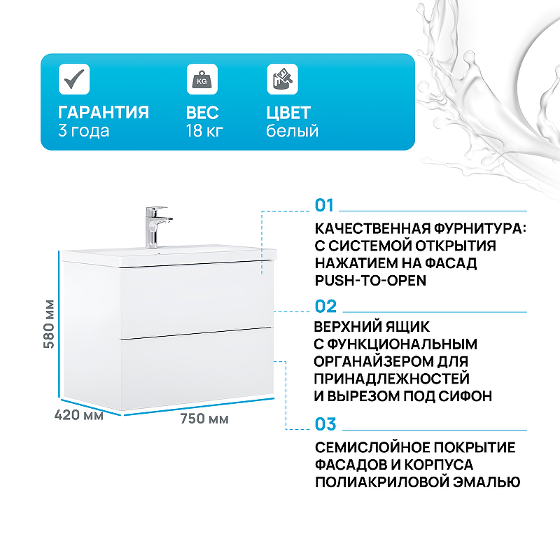 Тумба под раковину подвесная AM.PM Gem 75 см 2ящ белый глянец M90FHX07522WG