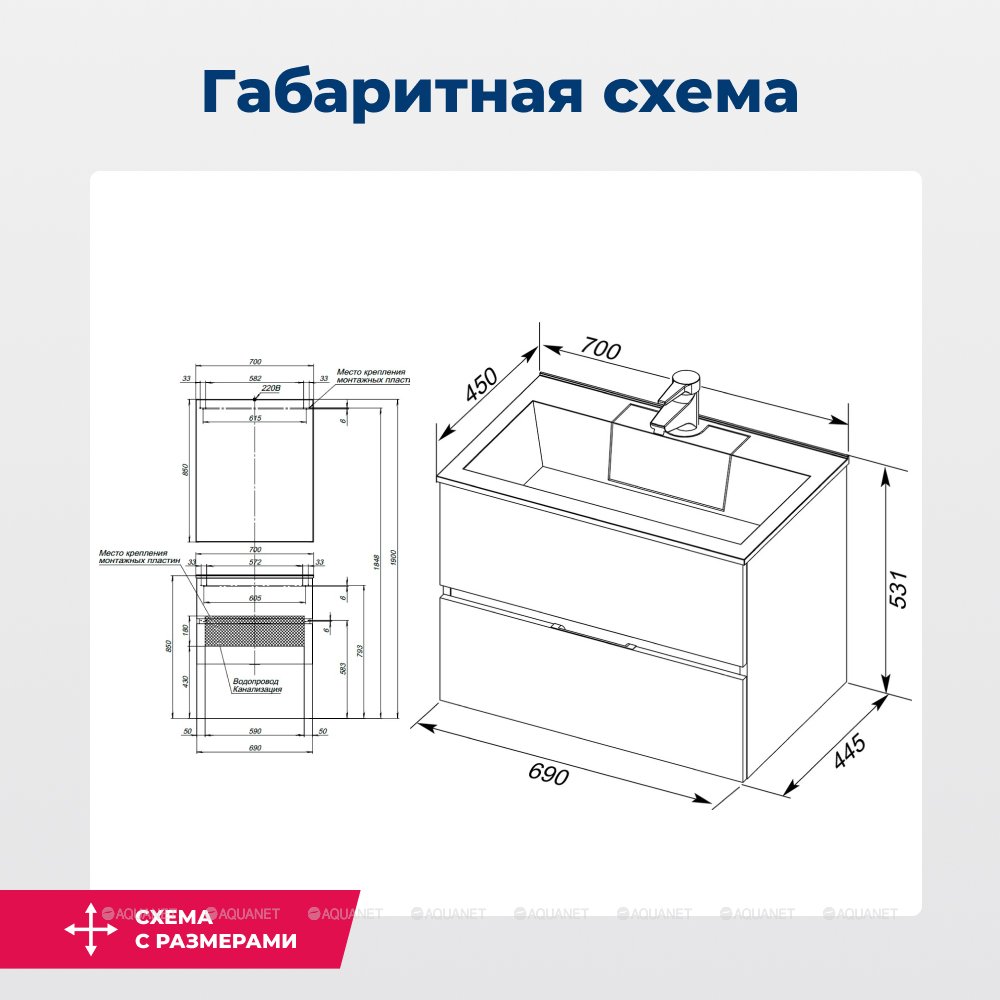 Тумба под раковину подвесная Aquanet Алвита 70 см серый антрацит 183992