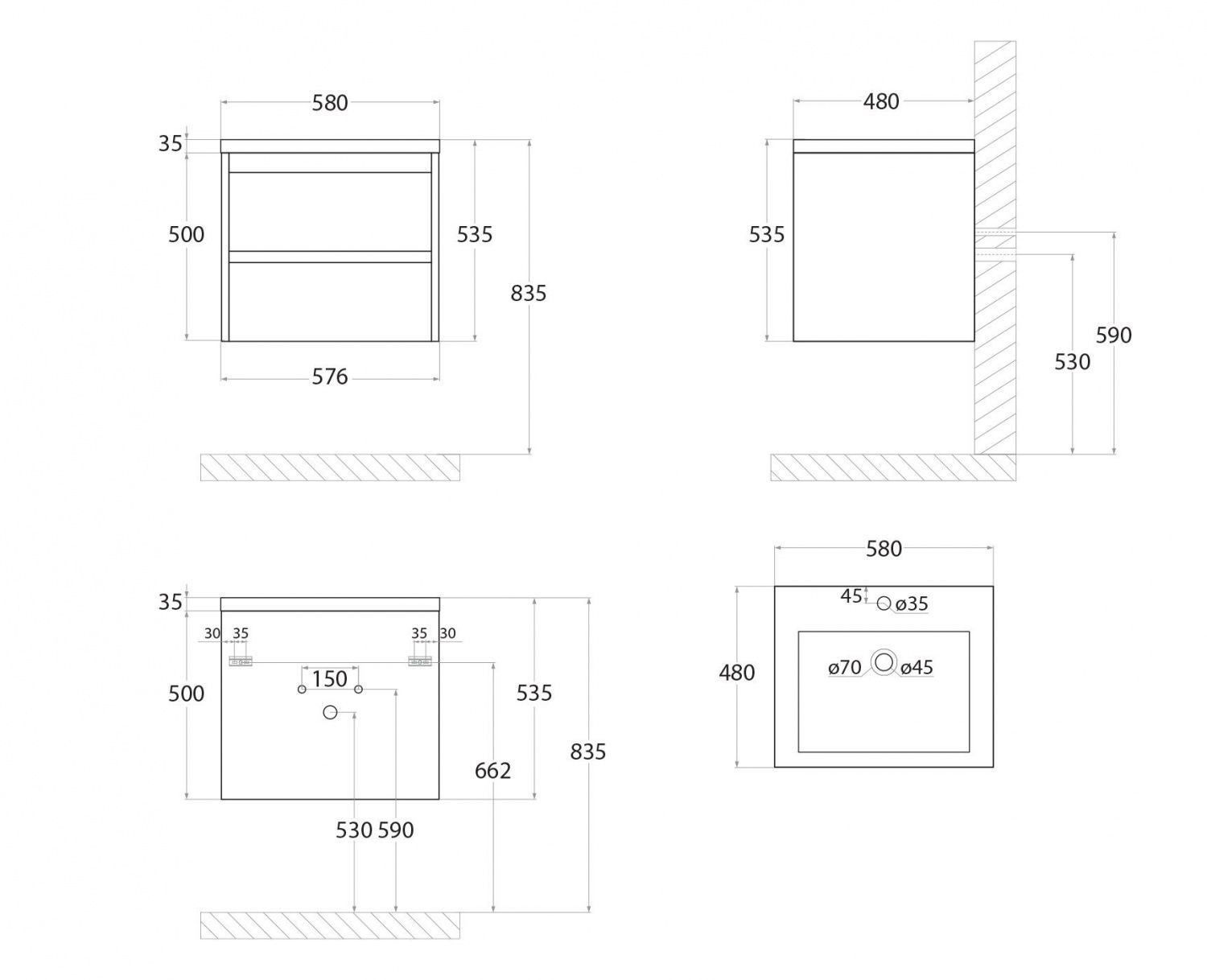 Тумба под раковину подвесная Art&Max Family-M 58 см 2ящ угольный камень Family-M-580-2C-SO-HC