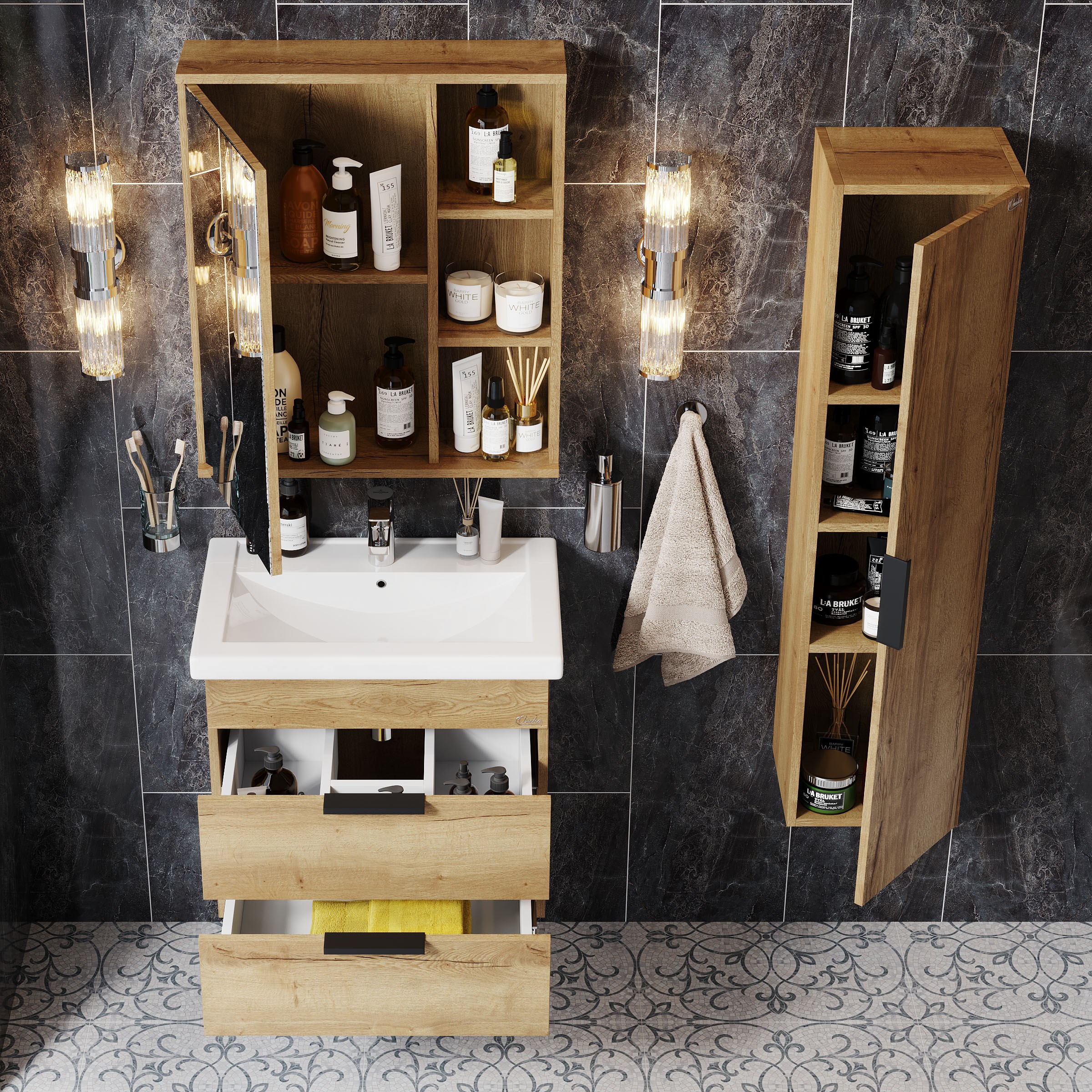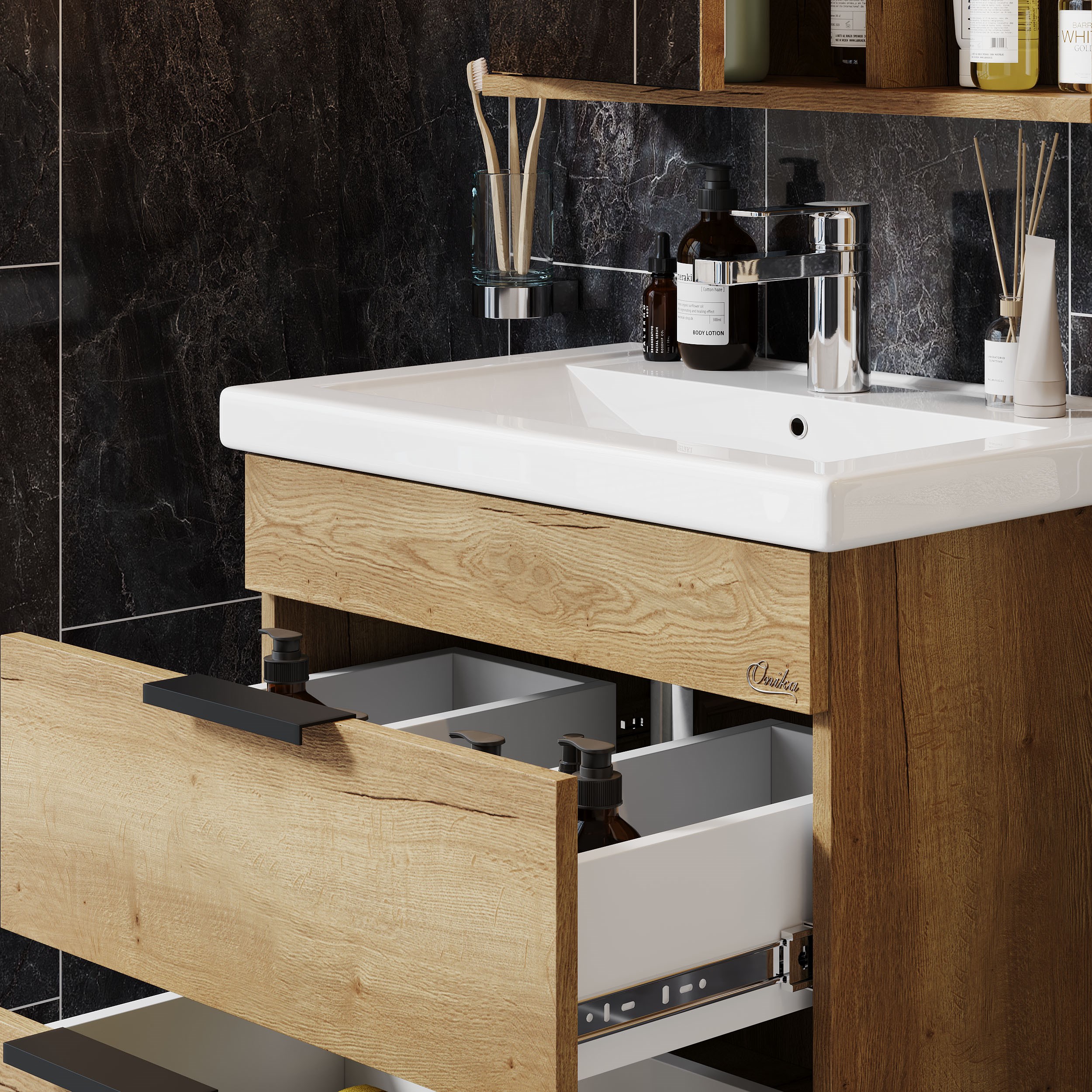 Подвесная тумба для ванной комнаты Onika Легран 60 - это сочетание насыщенного древесного декора и благородства металла: роскошная текстура и натуральный цвет дуба дают теплоту, а матовые металлические ручки добавляют урбанизма и солидности. Два ящика тумбы плавно открываются и закрываются благодаря направляющим полного выдвижения с доводчиками. Нижний ящик предназначен для больших предметов, а верхний, имеющий удобную систему организации пространства, - для мелких аксессуаров. Тумба выполнена из ЛДСП, устойчивой к механическим воздействиям, перепадам температур и высокой влажности, при этом она надежно крепится к стене и не занимает место на полу, не создавая при этом сложностей в уборке помещения. Ручки и подвесы для крепления тумбы - в комплекте.