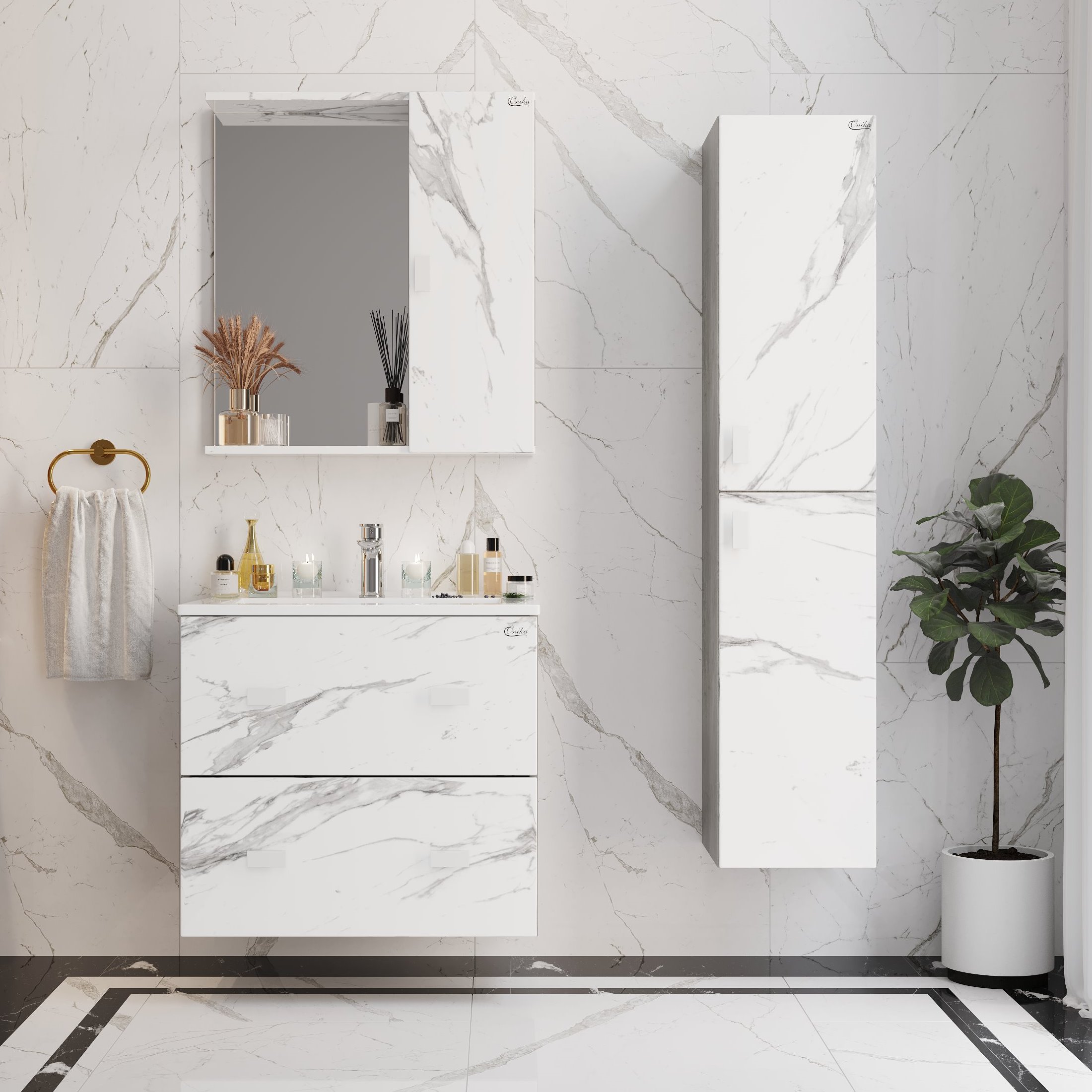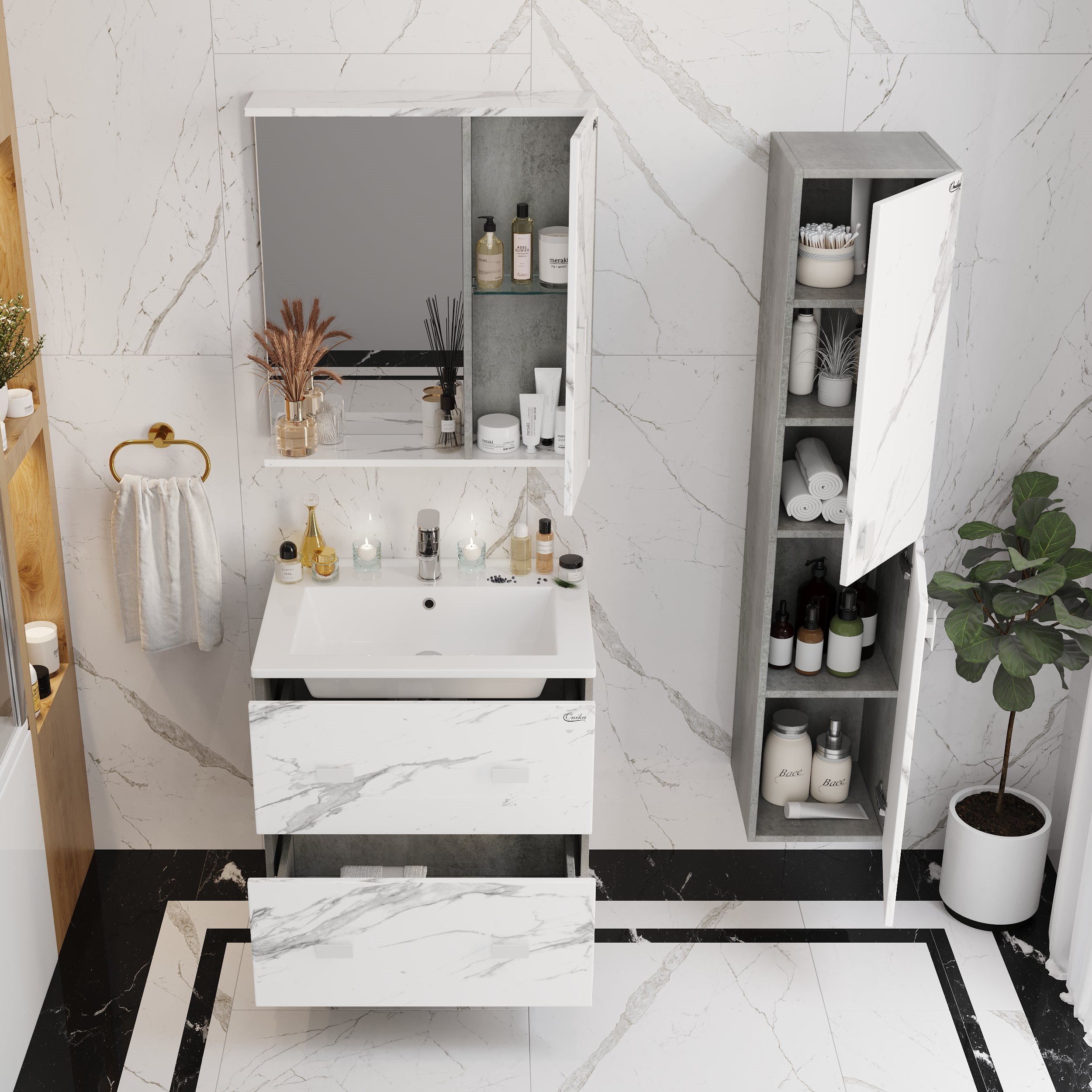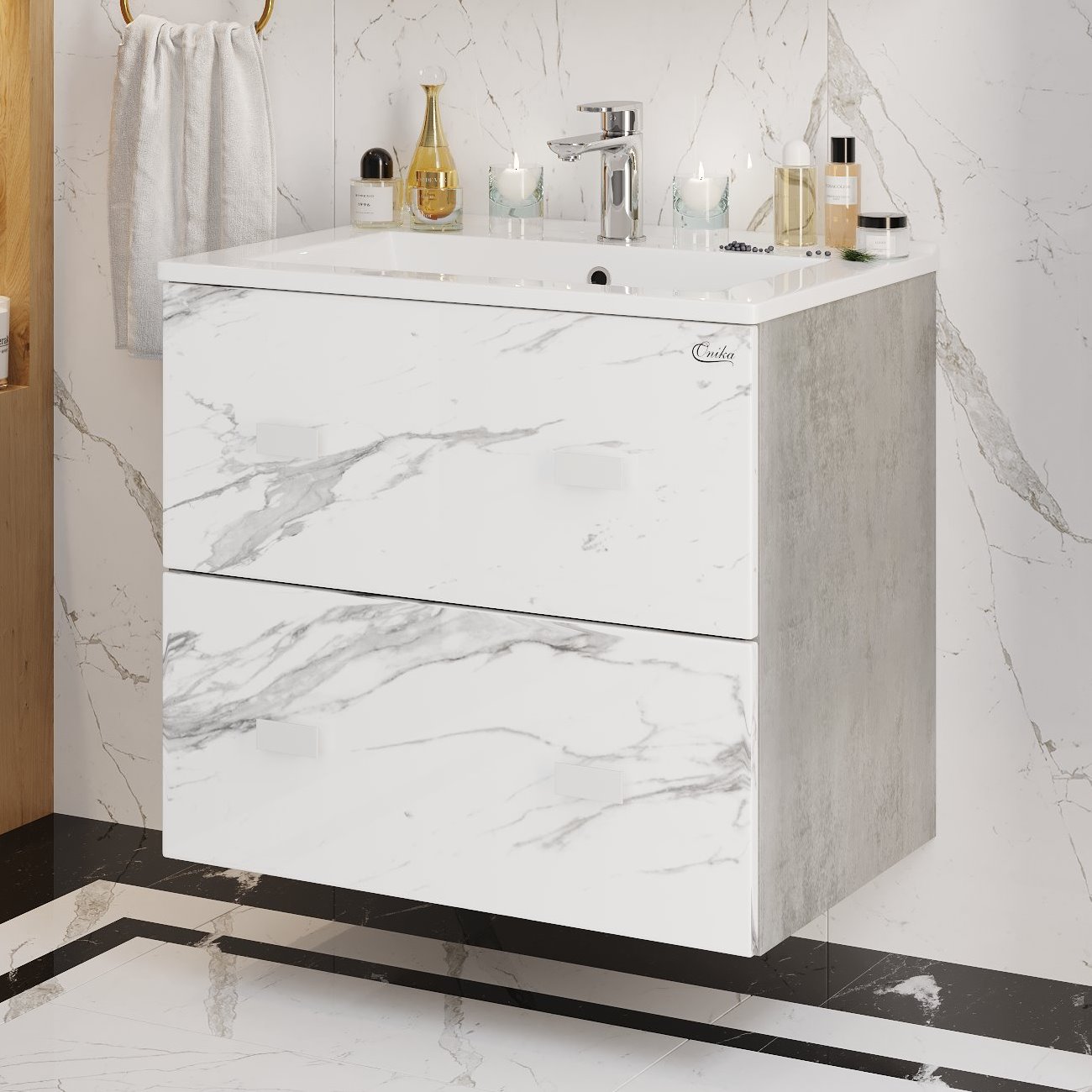 Подвесная тумба Onika Марбл 65 станет стильным и функциональным элементом пространства современной ванной комнаты. Спроектированная дизайнерами в минималистичном облике, тумба отражает самые актуальные расцветки сезона - бетон и мрамор. Два ящика тумбы плавно открываются и закрываются благодаря направляющим полного выдвижения с доводчиками. Нижний ящик предназначен для больших предметов, а верхний, имеющий удобную систему организации пространства, - для мелких аксессуаров. Белые матовые ручки практически не заметны на фасаде и не отвлекают взгляд от текстуры мрамора. Корпус тумбы выполнен из ЛДСП, фасады ящиков - из ЛМДФ в пленке, устойчивых к механическим воздействиям, перепадам температур и высокой влажности. Тумба надежно крепится к стене и не занимает место на полу, не создавая при этом сложностей в уборке помещения. Подвесы для крепления тумбы и 4 белые матовые ручки - в комплекте.
