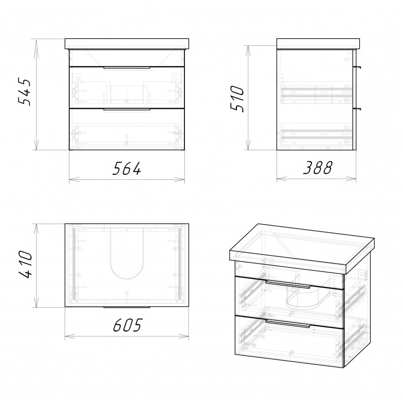 Тумба снабжена двумя ящиками, которые укомплектованы направляющими плавного закрывания, ящики предназначены для хранения различных предметов. Тумба выполнена из влагостойкого ЛДСП, устойчивый к перепадам температур и высокой влажности, крепится к стене и не занимает место на полу. Ручки и подвесы для крепления тумбы - в комплекте.